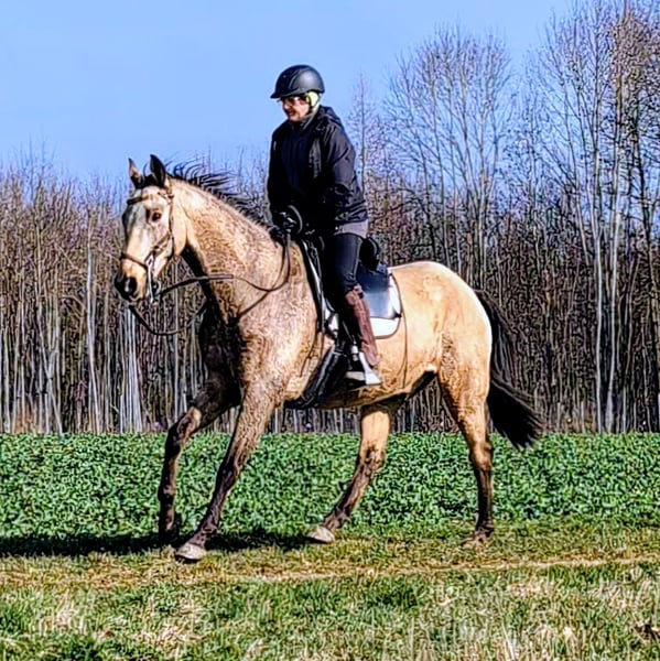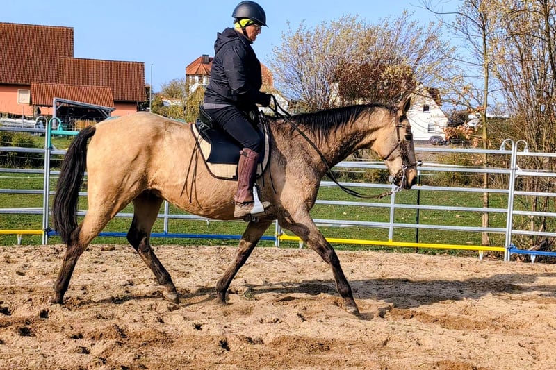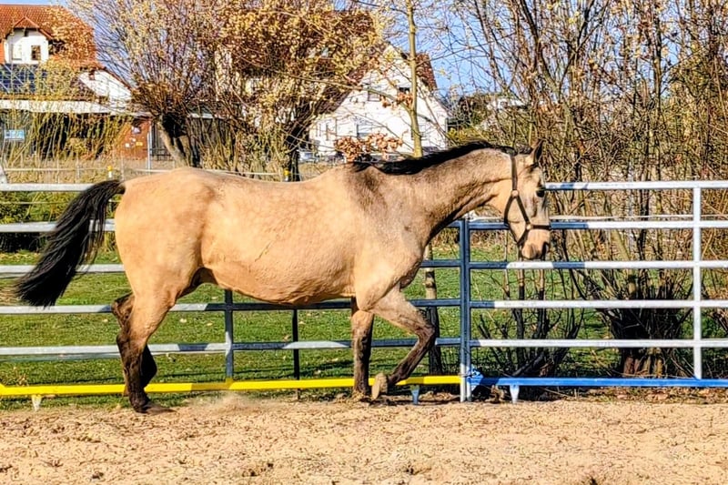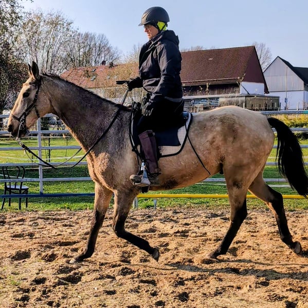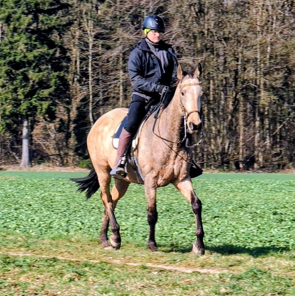 Our Liski, an Achal-Tekkiner stallion from Jost and Urte Appel (Classic Performance Stud, Solms), is suitable for beginners as well as for all riders seeking a calm and well-behaved endurance horse. Whether in a group or alone, he remains consistently relaxed and under control. He is a valuable companion for young horses starting their training in the field, as well as an excellent training partner for horses that need to stay at the front. Calm does not mean slow. This makes him the ideal partner for any leisure rider who wants to explore the countryside, go on trail rides, enjoy riding holidays, or make trips with the trailer. Liski is not ready for early retirement; he still wants to go out into the terrain with his rider and, even out of practice, perform gymnastic exercises in the arena. He is a large-framed horse with plenty of stride in walk and trot, and a wonderful canter that keeps the pulse down. He still has a few good years ahead of him, after which he can happily return to us and enjoy his retirement. His only weakness: laying his ears back. We misunderstood this behavior years ago when he was backed. He shows no dominance with this; rather, he is expressing his displeasure when approached too forcefully. He does not need a fiery rider constantly on edge and demanding hurriedly, but one who values calmness and patience. Are you the right match?