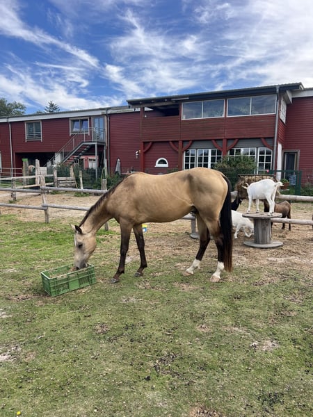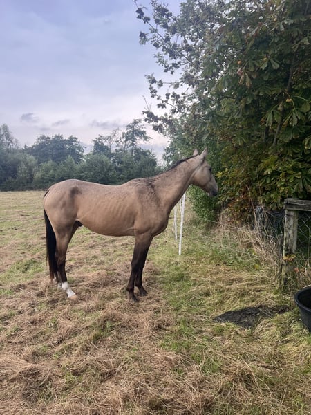 Junger Achal-Tekkiner sucht 5 Sterne Zuhause. Djantemir ist ein 6-jähriger Achal-Tekkiner mit einem Stockmaß von 1,56 m. Er wurde 2019 in Russland gezogen. Er ist ein Pferd zum Selbstausbilden – ideal für erfahrene Reiter. Ich selbst habe ihn vor etwa fünf Monaten gekauft, habe mich beim Kauf jedoch etwas überschätzt. Djantemir ist im Umgang noch recht unsicher. Er lässt alles mit sich machen, braucht dabei aber eine ruhige, erfahrene und sichere Hand an seiner Seite. Geritten wurde er bisher nur im Schritt, da er sich noch am Anfang seiner Ausbildung befindet. Satteln und Trensen klappt problemlos. Stillstehen und Geduld sind für ihn noch eine Herausforderung. Er macht alles brav mit, zeigt jedoch nach etwa zehn Minuten Stehen etwas Unruhe, da er einfach noch ungeduldig ist. Hufe gibt er, ist dabei aber noch etwas unausbalanciert, was ihn manchmal verunsichert. Mit weiterer Übung wird auch das bald kein Problem mehr sein. Er kennt Hunde, Kinder, Autos, Traktoren und Lärm und zeigt sich dabei stets von seiner besten Seite. Auch Platz und Halle sind ihm bekannt, wo er sich ebenfalls artig zeigt. Bei mir war er bislang nie krank oder lahm. Die Zähne wurden im September 2025 frisch gemacht, Tetanus- und Influenza-Impfungen wurden im selben Monat aufgefrischt. Außerdem wird er regelmäßig dem Hufschmied vorgestellt. Aktuell wird er 24/7 in Weidehaltung gehalten, nur zum Arbeiten und Füttern kommt er in den Stall. Boxenhaltung kennt er zwar, wünschenswert wäre jedoch Offenstallhaltung, da er in der Box unruhig werden kann. Ursprünglich wurde er für Distanzritte gezogen. Da er relativ unerschrocken ist, wird er mit Sicherheit ein toller Ausrittpartner. Mit dem richtigen Reiter hat er aber auch das Potenzial für deutlich mehr. Es handelt sich hierbei nicht um einen Notverkauf – ich gebe ihn nur in beste und erfahrene Hände ab. Eine Besichtigung ist nach Terminvereinbarung selbstverständlich möglich. Nachrichten gerne per WhatsApp an +49 173 2716155