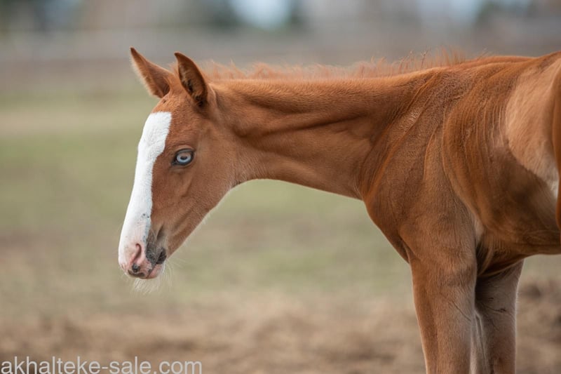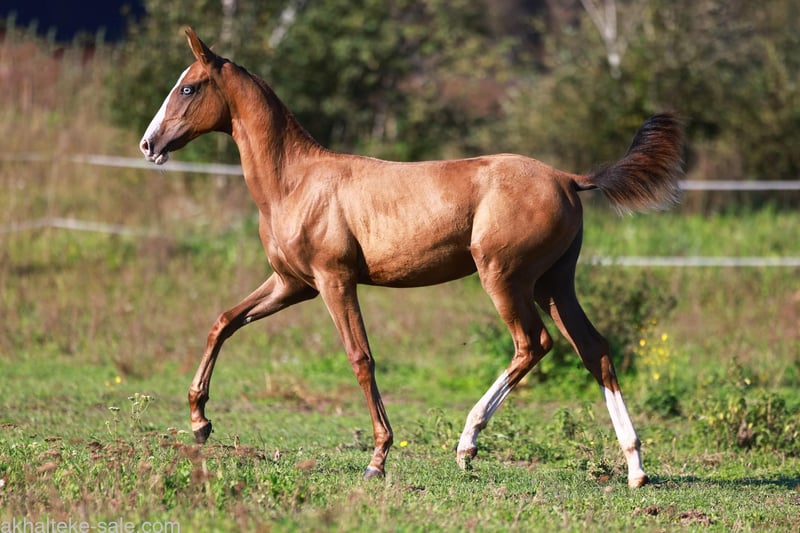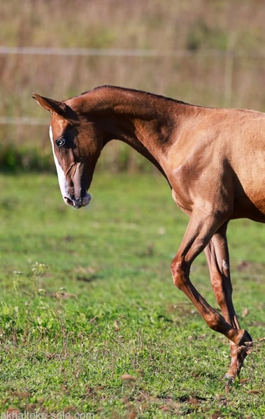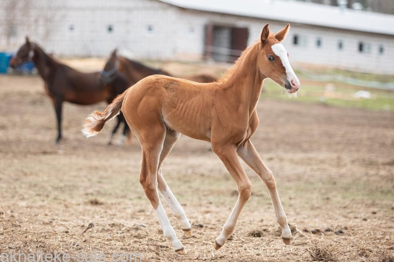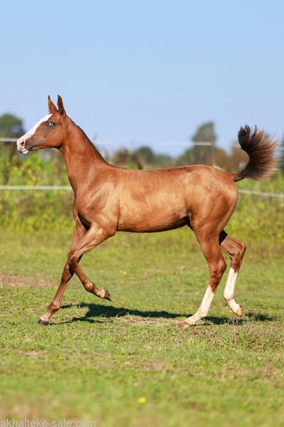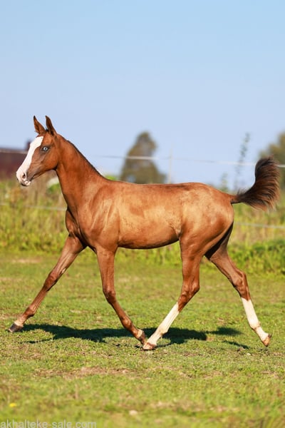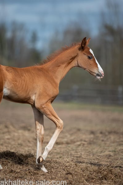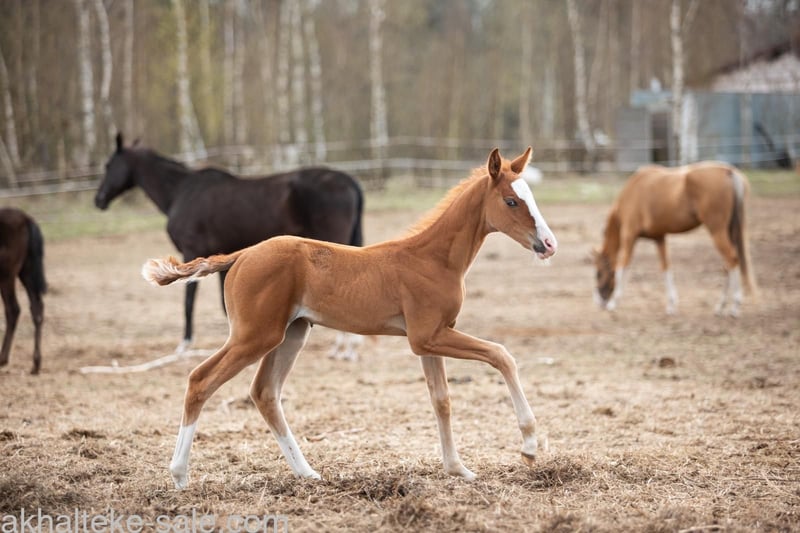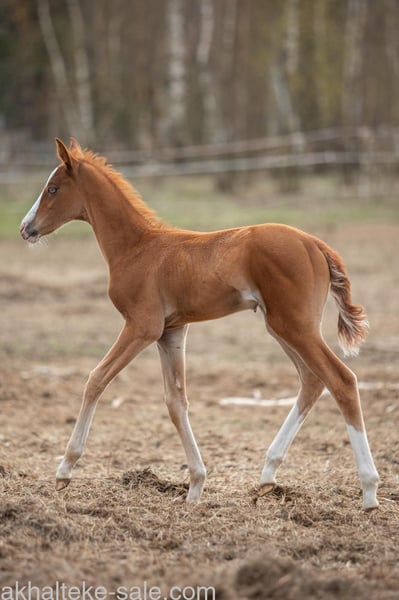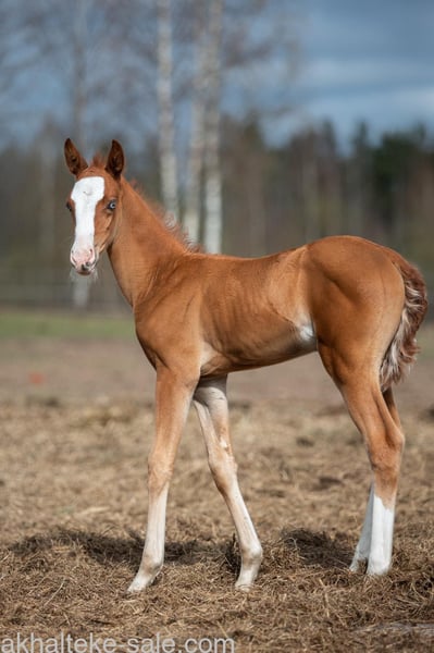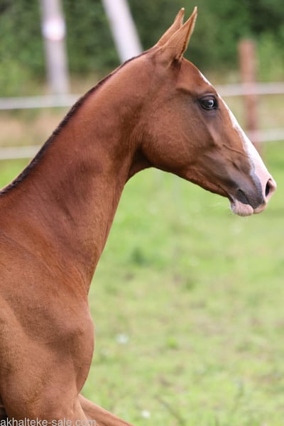 **For Sale: Akhal-Teke Mare** We are pleased to present a stunning Akhal-Teke mare, Sovhos-2 bloodline, born in 2024. This wonderful creature stands out for her captivating red coat and blue eyes. Her current height at the withers is 143 cm, but she has an excellent growth potential. Daykiri has a great pedigree, conformation, and temperament. Our mare is particularly suited for dressage, thanks to her intelligence and balanced temperament. She is an elegant and agile animal, perfect for riders of all levels looking for a trustworthy companion for their equestrian adventures. If you are interested in learning more about this extraordinary mare, please do not hesitate to contact us for further information and to arrange a visit. Don't miss the opportunity to add a gem like this to your stable!