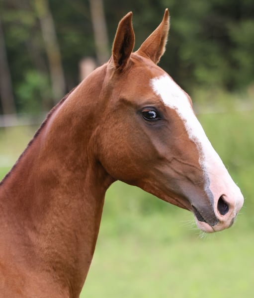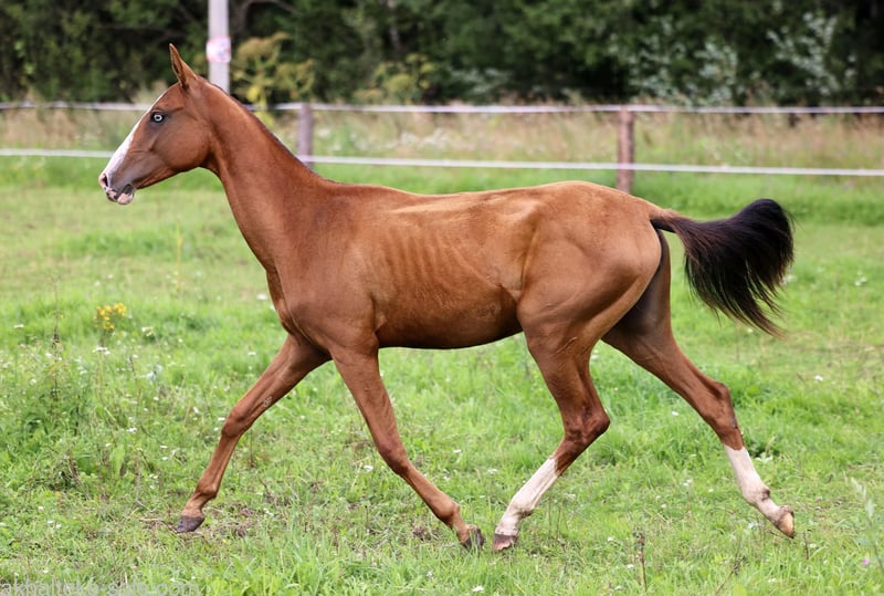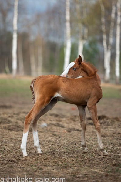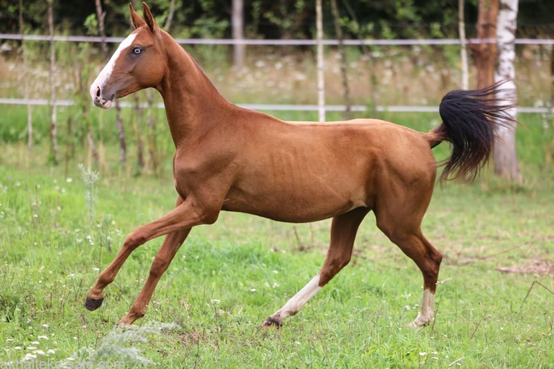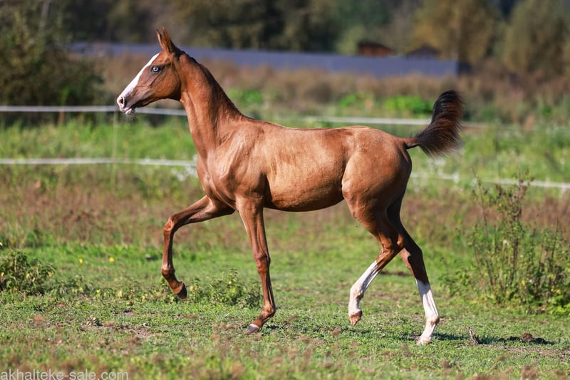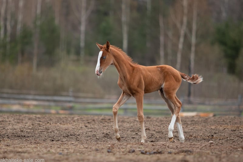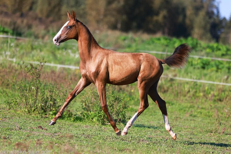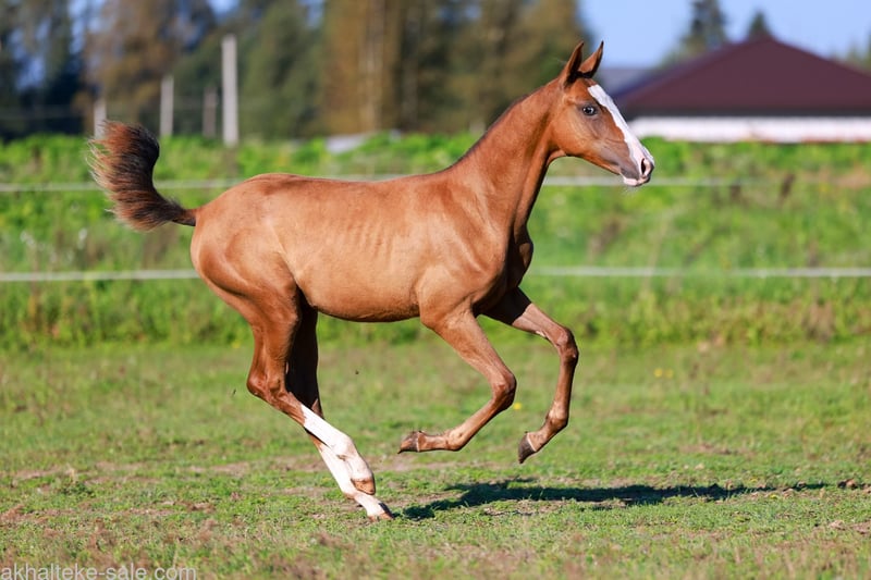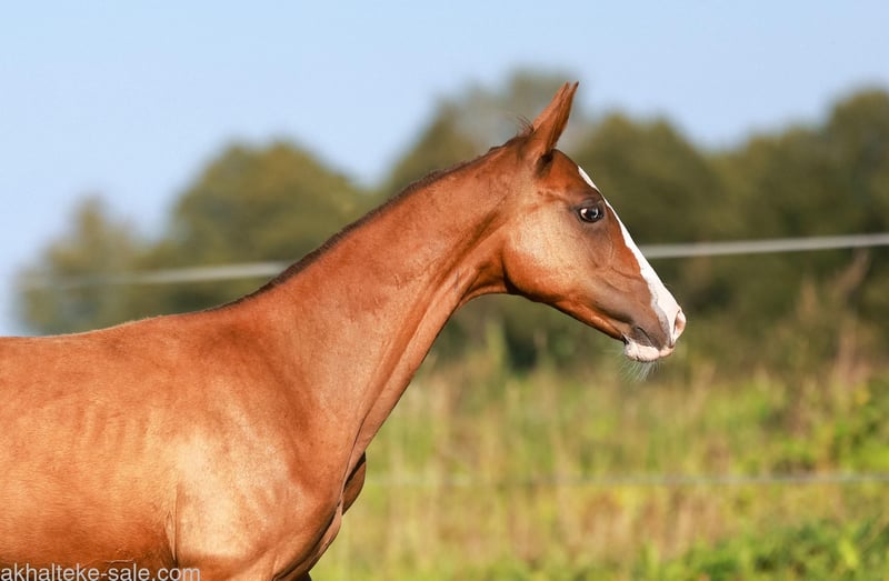 **For Sale: Akhal-Teke Mare** We are pleased to present a stunning Akhal-Teke mare, Sovhos-2 bloodline, born in 2024. This wonderful creature stands out for her captivating red coat and blue eyes. Her current height at the withers is 143 cm, but she has an excellent growth potential. Daykiri has a great pedigree, conformation, and temperament. Our mare is particularly suited for dressage, thanks to her intelligence and balanced temperament. She is an elegant and agile animal, perfect for riders of all levels looking for a trustworthy companion for their equestrian adventures. If you are interested in learning more about this extraordinary mare, please do not hesitate to contact us for further information and to arrange a visit. Don't miss the opportunity to add a gem like this to your stable!