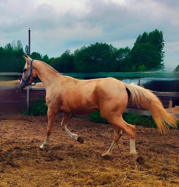 A gorgeous, large mare with a magnificent palomino color, all knee-high socks, and beautiful markings. She has excellent conformation and character, is even-tempered, calm, and well-trained. She spends a lot of time with the herd and receives all the necessary exercise. She has breeding papers and is suitable for any sport or breeding. We can arrange delivery and documentation.