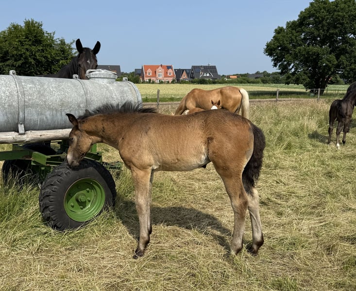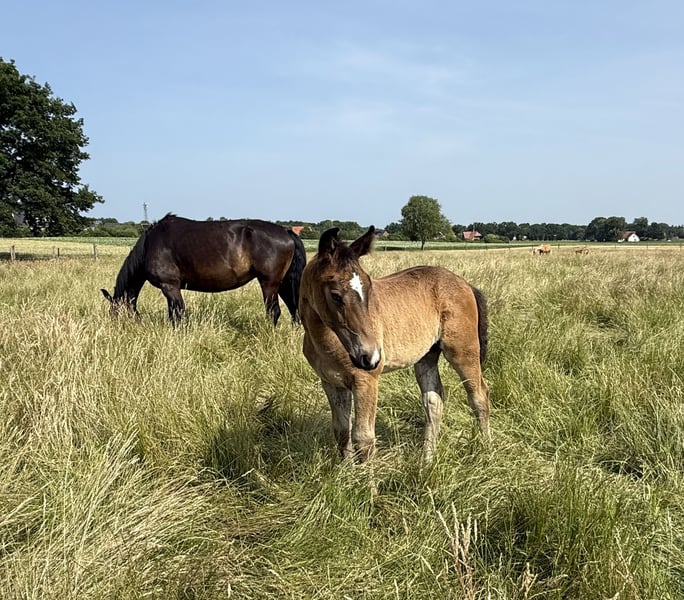 For sale is our charming Oldenburg filly Bibi – a true rough diamond with the best prerequisites for sport, breeding, and as a reliable leisure partner! Profile: Name: Bibi Gender: Filly Breed: Oldenburg Born: April 2025 Color: Dark brown Pedigree: Sire: Eichsfelder v. Elitär Dam: Landor G v. Landor ✨ Characteristics: Bibi impresses with correct conformation, excellent build, and three very good basic gaits. She is already halter-trained and shows herself to be very people-oriented, affectionate, and open in daily handling. Particularly noteworthy is her relaxed, clear character – shaped by her reliable, strong-charactered maternal line, known for its nerve strength and willingness to perform. Breeding & Prospects: With her excellent pedigree, consisting of proven lines like Elitär and Landor G, Bibi has everything that modern breeding demands. The combination promises rideability, performance, and character – with the right support, a true future horse! Location: Dötlingen Contact: If you are interested, we look forward to a message or a call – come meet Bibi in person and see for yourself her charm and potential! Pictures & videos available upon request Bibi – a future to fall in love with!