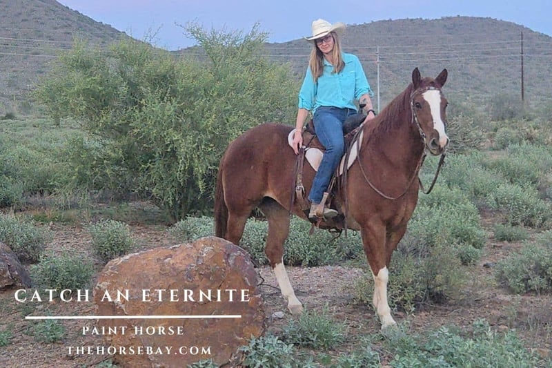 Catch is a flashy, registered sorrel paint gelding with four long white socks and a solid, muscular build — truly built like a tank! He’s an easy keeper, gets along well with both mares and geldings, and loves being turned out. Catch enjoys attention and will happily follow you around — he’s the kind of horse that loves having “his person.” Ground Manners: Catch is a gentleman to handle. He leads quietly, never crowds, stands tied for grooming, and saddling. Catch really enjoys being hosed off and bathed. He’s good for the farrier and prefers to be held instead of tied to a post (never tried cross ties). He loads like a dream — just point him at the trailer and he hops right in. He hauls calmly, eats and drinks on the road, and backs out quietly. Under Saddle: Catch has a nice handle and is a pleasure to ride. He walks out confidently, has a smooth trot and lope, neck reins, stops big, and will leg yield, side pass, and spin with ease. Experience & Temperament: We’ve owned Catch for about a year. He came to us with a background in calf roping and ranch work. While he can get a little hot in the arena, he’s absolutely in his element on the trail. He doesn’t mind barking dogs running around and chickens quacking. He might question your sanity when you add a new creature type to the farm, but he will trust you if you show him that they are safe (we have an emu) Trail Star: Catch shines out on the trail and in the mountains! He’ll go out alone or with a group, confidently leaving the herd behind. He’s traffic safe, sure-footed, and willing to cross logs, ditches, and ravines. Whether you stay on the trail or blaze a new one, Catch will go all day without quitting. He’ll pick up a trot or lope when asked and come right back down to a walk on a loose rein. I’m sure he’d be awesome on a cattle drive, too. If you’re looking for a strong, good-minded, and people-loving gelding who’s ready for miles of trail adventures, Catch might be your perfect match.