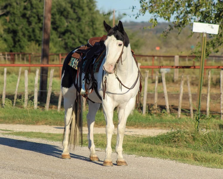 ONLINE AUCTION Place your bids at www.PlatinumEquineAuction.com Starting Bid $3500 Auction ends November 24th, 2024 Need a new saddle? Check out White Rock Saddles on our website or Facebook! Let me introduce to you this GORGEOUS one of a kind gelding known as Captain . He is a 8 year old black and white paint gelding standing 15hds tall. Captain is uniquely marked with blue eyes, a two tone black and white tail . This guy is GORGEOUS and is for sure going to get you noticed wherever you may take him. He has spent most of his young life on a ranch while doing all of the ranch chores , he has roped sick cattle outside, he has seen many many miles out on the ranch gathering and also checking fence. Captain has a awesome little lope to him and he will lope right out of your hand like butter , he is one handed broke, neck reins, moves off your leg , he will walk,trot and lope circles in the arena or out in the open field. He goes down the trail wherever you point him, ride him on the steep mountain trails or out in the flat grasslands he handles it all. Hes user friendly and isn’t complicated to ride at all. Captain is traffic broke he’s been rode down busy hwys, and also down at the Fort Worth Stockyards where he starred in a group of high schoolers school project , he was obviously the STAR of the show!!! And had great patience through it all. He has been rode in rodeo grand entry’s and parades. Everyone loves a gorgeous paint horse , I guarantee you won’t find another one like him!!! Captain will self load into the trailer, he stands tied with patience and no nonsense, stands for the farrier, and loves his bath time. Hes easy to tack up and bridle. Stands to be mounted and also stands for the mounting block. He can be turned out in a herd setting or stalled. Contact us to come try him, or we can set up a FaceTime also. If you need help with transport don’t hesitate to ask we have a list of reputable haulers that can get him safely to your doorstep world wide from Stephenville, TX. Contact M $ Performance Hores Michelle 661-817-9120 with any questions. ONLINE AUCTION Place your bids at www.PlatinumEquineAuction.com Starting Bid $3500 Auction ends November 24th, 2024 Need a new saddle? Check out White Rock Saddles on our website or Facebook!