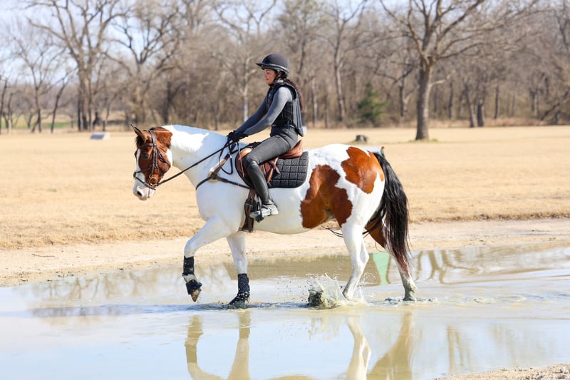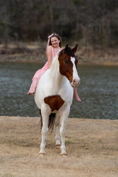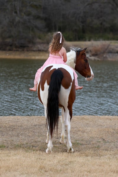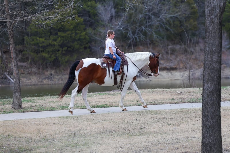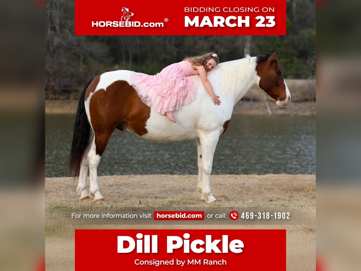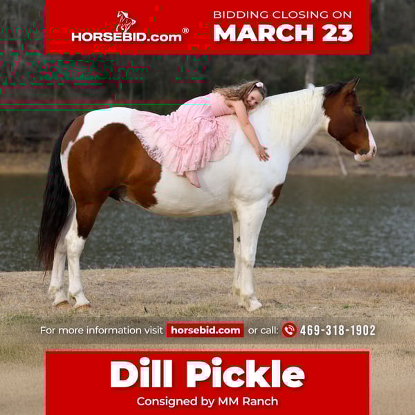 ⚜️𝓽𝓱𝓮 𝐆𝐎𝐋𝐃 𝓢𝓮𝓵𝓮𝓬𝓽⚜️ Happening now thru MONDAY | MARCH 23rd - Available EXCLUSIVELY on HorseBid's website! For more details and to register visit: www.Horsebid.com CONSIGNOR CONTACT: MM Ranch 469-318-1902 LOCATION: Forney, TX BREED: Paint Crossbred REGISTERED: Yes REGISTERED NAME: Dill Pickle COLOR: Bay & White Paint HEIGHT: 15.3 AGE: 10 GENDER: Gelding 🥒🥒Introducing Dill Pickle🥒🥒!! He is a gorgeous bay and white paint crossbred gelding. He stands 15.3 hands tall and weighs just a little over 1350 lbs. His crossbred side really shows in how stout and wide he is. He has a lot of bone and foot to him. But the perfect size and has a lot of athleticism. To me he is the perfect mix to make him the perfect all around using size. And he is just 10 yrs and has his whole life ahead of him. 🥒 Dill Pickle is one you can take to the shows or hit the trails on and truly enjoy. He is hands down a perfect all around family friendly and family favorite horse!!!! One that is bombproof and safe for anyone to ride!!! Let me say it again, he is SAFE for anyone to ride. He is at the perfect age of just 10 yrs old. 👉🏼SHOW EXPERIENCE: Dill Pickle is a natural in the show ring and on the cross country course. Rides both English and Western. Very versatile and athletic horse. Acts the same as he does at home. He's been shown at the local shows in 4H classes, English jumping, amateur English dressage, and also western ranch trail classes. Dill Pickle is the type you can enjoy and learn on. He's responsive to your seat and leg but not overly responsive or overly sensitive. He will go just as fast or as slow as you'd like. He's got a comfortable easy to sit rocking chair lope, automatic lead changes, an easy stop, and turns around correct and pretty. He's so open minded and willing. You could take him to the hunter classes and really hold your own! He packs his head low and correct and goes right to the jumps! Very pretty mover. Really picks up his knees and carries his self well. 👉🏼TRAIL&RANCH EXPERIENCE: Dill Pickle loves to trail ride!! Down the road, through the woods or take him swimming! He loves going new places!! He doesn't mind traffic, dogs or wildlife. He goes up and down the big hills carefully and easily and he goes right into the water! He loves to play and splash in the river! He will ride front, middle or back of the pack. Not at all buddy soured if you like going out on the trails alone. Been rode on a ranch and used to push cattle. Been roped of out in the pasture to help doctor sick calves. He would be perfect to help tend to a small herd or check fences on. The perfect weekend type horse. 👉🏼DISPOSITION: Dill Pickle is extremely sweet and loves being loved on. He comes right to you and puts his head in the halter. He loves kisses and having his ears scratched. Pickle is very quiet and easy to ride and be around. He is all for the rider trying new things or going new places. He is up for it. Even happy about it. He's got a very go with flow way about him. He doesn't get upset when his rider gets off balance or in his face. He's very forgiving if you mess up or give the wrong command. He would really make an excellent addition to a lesson program or just a casual rider wanting a very broke horse to enjoy! 👉🏼UPKEEP: Dill Pickle is an easy keeper. He's currently eating alfalfa hay. Which he could stay fat on weeds. When I say easy keeper. He requires nothing special. He is UTD on everything and currently barefoot. He does not need shoes. He does perfect barefoot. But has wore shoes plenty and very easy to shoe. Has good hard solid feet. 👉🏼LOADING: Dill Pickle loads and hauls like a dream. Very quiet and patient in and out of the trailer. He stands quietly tied to the trailer at the horse shows. No pawing or throwing a fit if left alone either. So makes it so easy if you want to go to the shows or trail rides with just one horse. 👉🏼TURNOUT: Dill Pickle can be by himself or in a group in the pasture. We've had him out with mares, geldings, mini ponies, mini cows, mini donkeys, etc.. without any fussing or drama. He is in the middle of the pecking order. Gets along with everyone. 👉🏼GROUND MANNERS: He is great on the ground. Respectful of personal space. He stands like a dream for grooming, washing, saddling, mounting block and he takes the bit easily. He will stand single tied and crosstied. Doesn't mind dogs, goats, small children around his feet. 👉🏼BAD HABITS/ VICES: Dill Pickle has absolutely NO bad habits or vices. Absolutely no buck, no rear, no bolt, no bite, or no kick. I cannot say it enough, this horse is a saint!!! He does not need to be warmed up or tuned up before you can go for a ride either. You can catch him straight out of the pasture and get on him. Even if it has been a few months since you rode him last. That’s a big plus in our books. Cause life gets busy and sometimes hard to make time to ride everyday. With him you don’t have to worry about that. 👉🏼TACK: We've ridden Dill Pickle in anything from a halter and lead rope bareback to a snaffle to a correction bit. Our go to bit of choice for him is a medium shank snaffle. English, western, bareback, backwards, sideways, forward, doesn’t matter to him. As long as he is getting attention from you he is happy!! 👉🏼SHIPPING: We can and will help arrange affordable shipping anywhere. He is up to date on all shots, feet, teeth, etc.. He is 100% ready for his new home. Ready to be rode and enjoyed. He is 100% sound and had a pre evaluation done by our vet (pic of it in the pictures). Buy with confidence that he is perfect in every way. Feel free to call us and visit with us about him. We love this horse and want to find him an amazing home!!