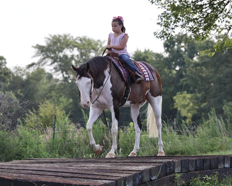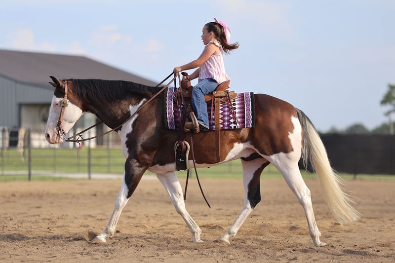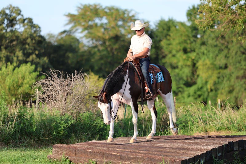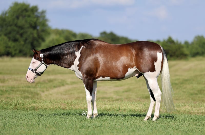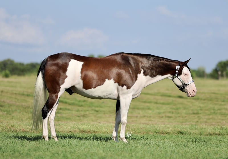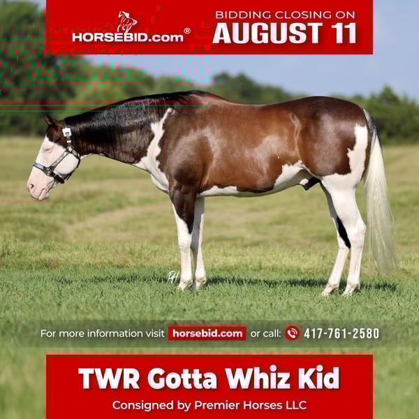 ⚜ The HERITAGE Classic ⚜ Happening now thru MONDAY | AUGUST 11th - Available EXCLUSIVELY on HorseBid's website! For more details and to register visit: www.Horsebid.com CONSIGNOR CONTACT: Premier Horses LLC 417-761-2580 LOCATION: Buffalo, MO BREED: APHA REGISTERED: Yes REGISTERED NAME: TWR Gotta Whiz Kid COLOR: Bay Overo HEIGHT: 15 AGE: 11 GENDER: Gelding Check out the pattern on Patriot, I can guarantee you have not seen one as unique as him! If you are looking to turn heads every where you go, look no further. He has a gorgeous dark bay base with the most piercing blue eyes. Patriot has a pretty long white tail and to switch things up, he has a solid black mare. How much more can you stand out? Oh, that’s right you can boast to your friends he is an own son of the legendary $7 Million Dollar Sire Spooks Gotta Whiz! If you are looking to add a superb gelding to your family that checks all the boxes, stop your search right here! Patriot has been shown and is an NRHA money earner, with his pedigree he has such a cool style all the way around. He is solid in his lead changes, flawless roll backs, and spins good. Would be a solid short stirrup or youth rider wanting to learn the basics and look sharp doing so. He is very patient with kids as young as 6 years old, either on the ground pampering him or riding him. Patriot absolutely melts in the hands of our daughter when she goes to the barn each day to give pets and treats. If you don’t have any interest in showing, that is totally fine because his resume does not stop in the arena. He does require show maintenance. Patriot is well versed on the trails and loves going on all kinds of adventures with his rider. He is a lot of fun to take across the obstacles, check the mailbox, and go over bridges on. Our daughter rides him around bareback most of the time and insists she carries the American Flag on him, he really is the best babysitter! He has impeccable ground manners and is very easy to handle. If you have ever dreamed of owning a son of Spooks Gotta Whiz, that notably stands out from the rest, do not miss out on your chance to add him to your family. Patriot is truly a remarkable gelding that will make anyone fall in love!