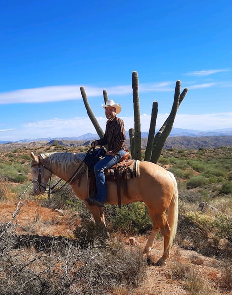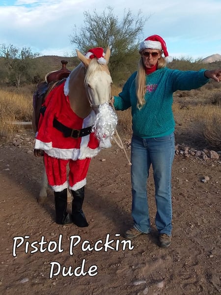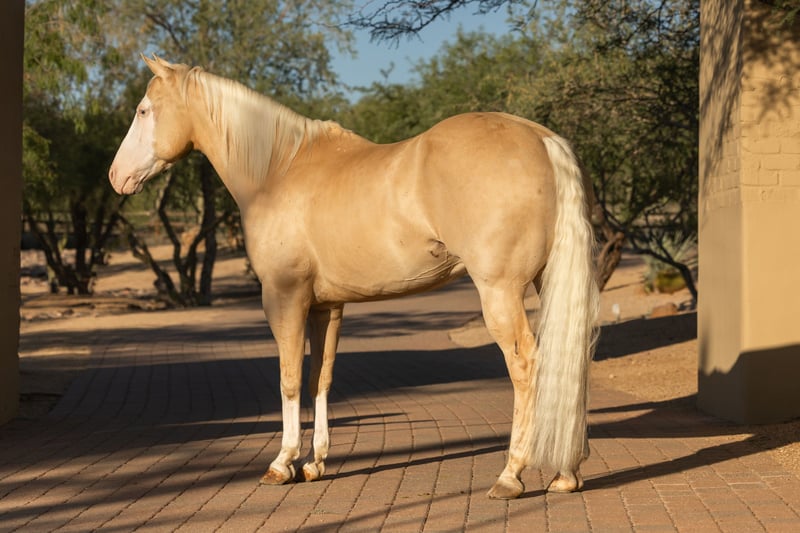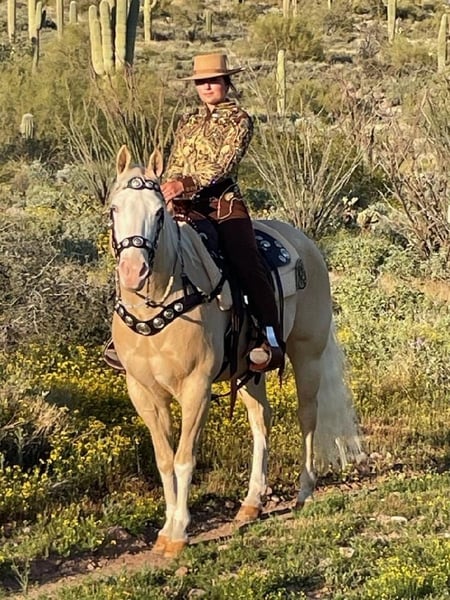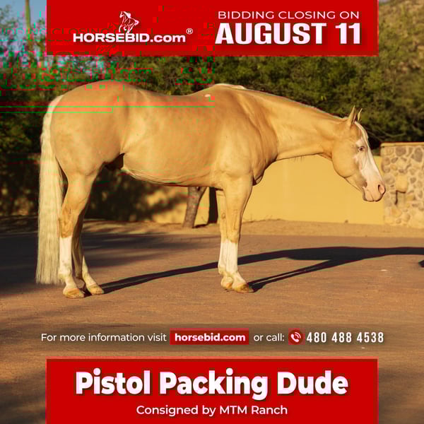 ⚜ The HERITAGE Classic ⚜ Happening now thru MONDAY | AUGUST 11th - Available EXCLUSIVELY on HorseBid's website! For more details and to register visit: www.Horsebid.com CONSIGNOR CONTACT: MTM Ranch 480 488 4538 LOCATION: Cave Creek, AZ BREED: APHA. REGISTERED: Yes REGISTERED NAME: Pistol Packing Dude COLOR: Palomino HEIGHT: 15.1 AGE: 11 GENDER: Gelding “Pistol Packing Dude” is a perfect prime age gelding with that stunning “iridescent” chrome gene Palomino color. His rare color is all set off with a thick beautiful creamy mane and tail that we have to trim 2 inches a month to keep off the ground. Pistol is flawless without a splint, bump or lump. He has Career earnings of over $30,000, gladly carrying dudes in his four, five and six year old year for us. The last four years he as only been Guided on. Extensive training in the arena started in his 6 year old year. He had never really even loped or stopped hard before that so chances of bad hocks and all those early hard use problems that come later in a horses life are not likely to show up. He was left to mature properly and was professionally started. Soft in the face with the snaffle, cow horse or full spade bit. Pistol lopes perfect soft slow circles and high speed big circles. He is a finished bridle horse. Check out his ranch riding video in its entirety as he never missed a beat. It won’t take a minute for you to pick us out of that crowd. That was only the second show. He did win. At his first show he placed first in confirmation under all three judges. As would be expected with his world champion double Skipper W pedigree. Let's not take for granted the dams side of Docs Prescription X DocOlena breeding. He cows up really hard. Possibly more than a beginner is ready for. He has been sorted on and was progressing really well. He really reads and tracks a cow naturally but aggressively. He did have three months of professional rope horse training with Jake Scott out of Wickenburg three years ago. I broke my right hand just when he was finished there and I have never roped on him since. He would require a tune up with a professional but he was very fast out-of-the-box as you will see in the videos. That's Jake Scott on the head and Chantz Stewart on the heels . We did shoot guns off him to check his ability and willingness. I am a former champion mounted shooter and he was fine, but I am professional. He was exposed to this three times but he could be finished out as the shooting horse. We did dabble around in working equitation he did fantastic every obstacle and it was exceptional with the garrocha so please check out our video as such. Long lines very well. He has been ridden English and never missed a lick, so that is not a problem if someone wants to do all around. He has been in three national commercials and pro advertising photo shoots. He's great with shiny boards and cameras. He is super willing and lives for attention . I would wish him to go to a busy “ride him every day home”. He has been with me since he was two years old and has had a four to six hour a day job every day since I started him. These busy using horses aren't meant to be ridden once or twice or three days a week. They're meant for daily job. If you don't keep them busy it is not fair and that is what makes him happy. He's a willing partner that will meet you at the gate kind of guy with 0 bad habits. He's literally been hauled thousands of miles to any place we chose to ride, he went willingly. He rides, slides and turns around in little circles and has great changes. Naturally of course he bends and flexes and side passes and that's why he has nice lead changes. It is unfortunate I had three bad bouts of COVID which have limited my agility and desire to keep on showing him. It is my greatest wish that he goes on and does great things with a good rider and willing partner. He of course is registered with the APHA but could double at AQHA shows he's obviously eligible for the Pinto PTHA World show and even could be registered as Palomino PBHA for which his father and grandfather were world champions Pistol is located in Cave Creek AZ and you are more than welcome come and try before you buy. We have some beautiful country. Please feel free to contact me at 480-488-4538. Pre purchase exams welcomed.