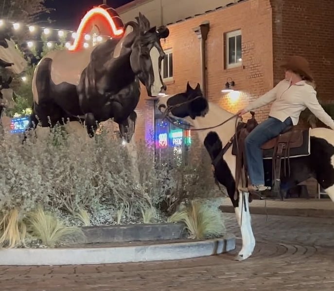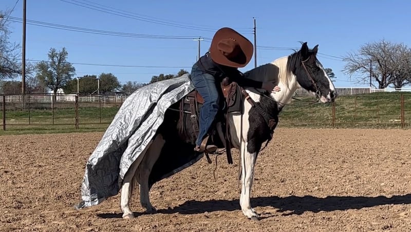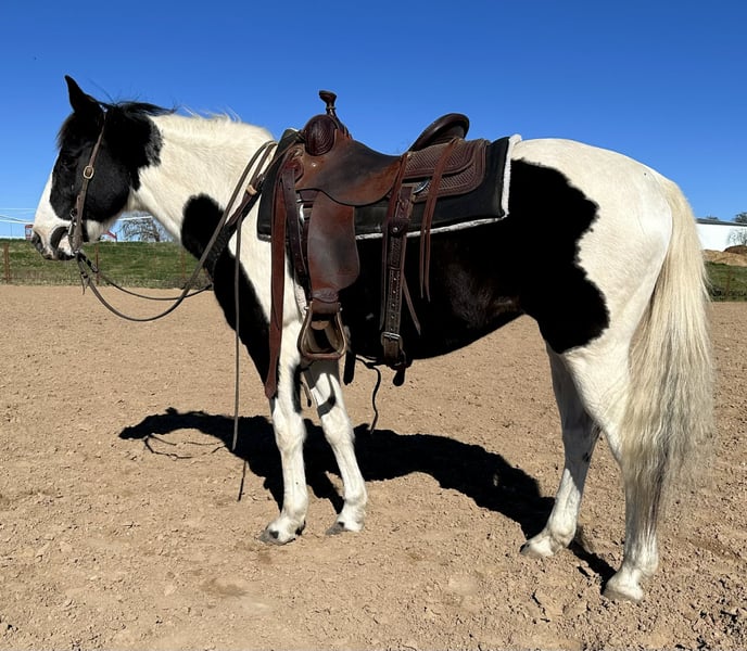 ONLINE AUCTION Place your bids at www.PlatinumEquineAuction.com Starting Bid $3500 Auction ends February 1st, 2026 Need a new saddle? Check out White Rock Saddles on our website or Facebook Zoey is a gorgeous 14.1H, 13 yr old black and white paint mare with one blue eye and a HUGE loving personality! She is a very gentle mare that is suitable for anyone! She’s incredibly safe and is the “more whoa than go” type. She’s been a trail horse the majority of her life and has been rode by various levels of riders. She is not a marish mare at all and she’s the bottom of the totem pole when turned out. Zoey is not spooky and handles all new adventures with ease! She has zero buck, bolt or bite and is the perfect easy going trail horse for anyone looking for something SAFE and gentle! She will neck rein, move off leg and switch gaits only when asked! Zoey is the kind you can leave off for weeks and jump on when it’s cold outside and not have to worry about any silly tricks. She’s absolutely gentle enough for the babies to be around/handle. She loves attention and has a huge loving personality! Zoey is great about all things and loads, leads, bathes, ties, and hauls with ease. She would make a great beginner horse, trail horse for anyone, or even lesson horse! She would be the perfect present for anyone looking for a starter horse for their kids this holiday season! Please call Blair with North Texas Horse Company for more info at 817-757-3046. We are located in Weatherford, TX and can help arrange affordable shipping to anyone!! ONLINE AUCTION Place your bids at www.PlatinumEquineAuction.com Starting Bid $3500 Auction ends February 1st, 2026 Need a new saddle? Check out White Rock Saddles on our website or Facebook
