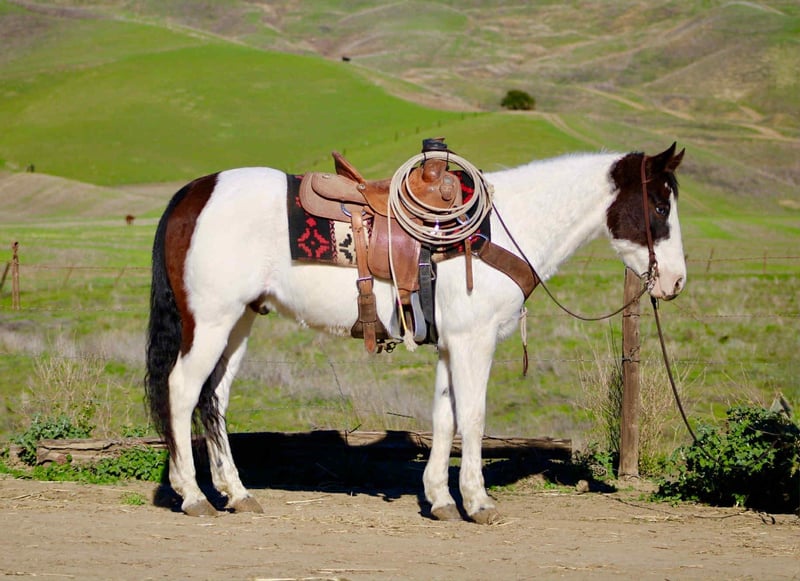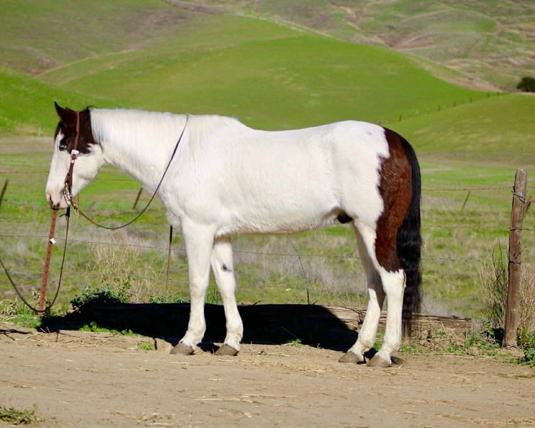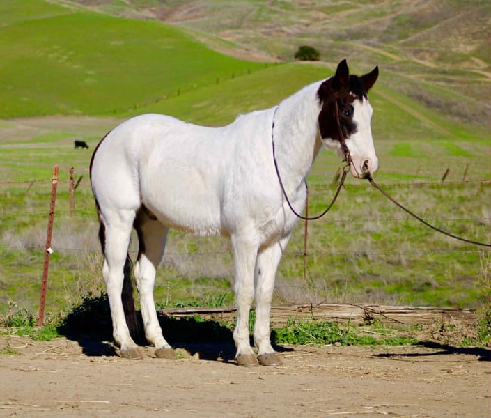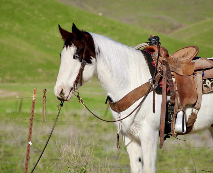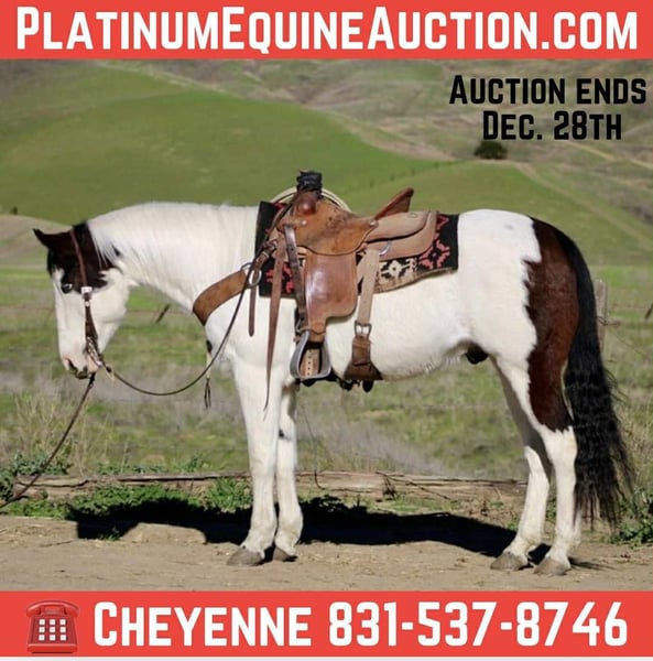 ONLINE AUCTION Place your bids at www.PlatinumEquineAuction.com Starting Bid $3500 Auction ends December 28th, 2025 Need a new saddle? Check out White Rock Saddles on our website or Facebook Blueboy is a handsome 12-year-old, 14.2hh paint gelding with two striking blue eyes and an easygoing, willing personality. He is a joy to be around and very simple to handle, making him a pleasant and reliable partner for a variety of riders. Blueboy has extensive experience on trails, roads, and in the arena. He excels on the trail and genuinely enjoys going on adventures. He travels confidently through steep, narrow terrain and moves with surefooted ease. He will lead the group without hesitation, ride calmly and consistently in the back, or go out alone with no issues. He is not buddy or barn sour and remains steady regardless of the situation. He also loves the water and will cross anything placed in front of him. Under saddle, Blueboy has a natural low headset and is very easy to direct. He neck reins, responds well to leg cues, has a dependable stop, and catches both leads easily in the arena. He is soft, responsive, and comfortable to ride. Blueboy is also good with time off and does not get fresh when brought back into work. He loads and hauls well and gets along nicely with other horses. With his temperament, trail experience, and solid training, Blueboy would make an excellent horse for trail competitions or for anyone looking for a trustworthy, enjoyable partner both in and out of the arena. He is located in Bitterwater, CA. for more info contact Cheyenne at 831-537-8746. ONLINE AUCTION Place your bids at www.PlatinumEquineAuction.com Starting Bid $3500 Auction ends December 28th, 2025 Need a new saddle? Check out White Rock Saddles on our website or Facebook