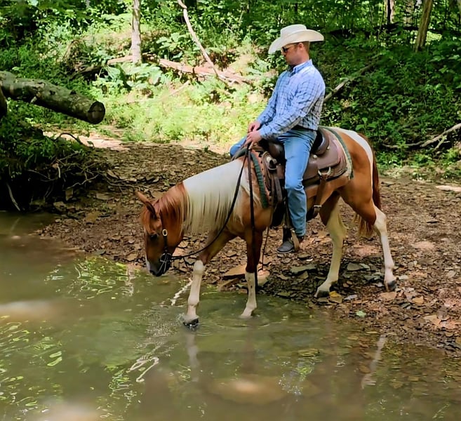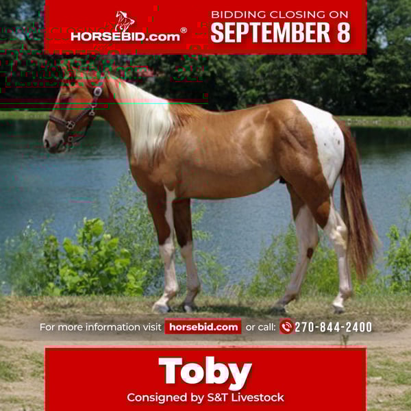 ♦️ 𝐭𝐡𝐞 𝐒𝐞𝐩𝐭𝐞𝐦𝐛𝐞𝐫 𝑺𝒆𝒍𝒆𝒄𝒕 ♦️ Happening now thru MONDAY | SEPTEMBER 8th - Available EXCLUSIVELY on HorseBid's website! For more details and to register visit: www.Horsebid.com CONSIGNOR CONTACT: S&T Livestock 270-844-2400 LOCATION: Henderson, KY BREED: Paint REGISTERED: No COLOR: Paint HEIGHT: 14 AGE: 2 GENDER: Gelding What a fancy well started 2yr old paint gelding. Toby is 14hands tall and sells grade because of his mother, he is an own son of metallic pirate who is a son of metallic cat really great blood lines on this cow bred colt. Toby has had 3 months of professional training with a great start on planting and turning correctly and really picking up his lead departure, as well as roll backs on the fence. He picks up both leads, side passes and has a good stop. You can swing a rope off him as well. Toby has been trail rode extensively and will cross creeks, go through any body type of water, thick brush, logs, bridges, rough terrain and up and down cliffs. He is not spooky. Toby has been rode by intermediate kids on the trails and does great with no fuss. He stands tied good to be saddled, farrier, baths, grooming and to get on. He will load and unload with ease. Toby is a very calm 2yr old with an easy going nature. He has never bucked from day 1 of starting him. It will be hard to find a 2yr old this mature for the time spent on him. Take him any direction you want and with his bloodlines he will make one heck of an easy going cow horse. We invite anyone and everyone to come meet and ride Toby at our barn in Henderson, Kentucky. We are happy to assist with transportation arrangements. For any questions about Toby please call or text Tasha (Agent) 270-844-2400