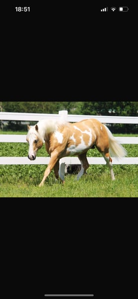 ⚜️ Buddy ⚜️ 2022 Paint Mix Stkm. : 153 cm - Achtung Fehlerteufel er ist 144 ! Barhuf Gesund AKU vorhanden! Buddy ist ein schicker, neugieriger und lernwilliger Allround - Palomino Wallach. Er kennt Weidehaltung / Offenstall & Box nachts ! Er ist sehr sozial und man kann ihn zu jedem Pferd dazustellen. Er durfte auf großen Weiden in der Herde beim Züchter gesund & artgerecht aufwachsen und wurde vor dem Verkauf, an die jetzige Besitzerin, noch angeritten. Damit seine Grundausbildung gefestigt - und er weiter gefördert wird, kam er zu uns ins Training. Buddy zeigt sich unglaublich lernwillig & ist für jede Aufgabe offen, denn er hat auch bisher nix schlechtes erlebt. Er kennt es vom Boden gearbeitet zu werden, Longieren, auch am Halfter. Stangen & Cavaletti - Arbeit. Beim reiten wurden Trail Basics erarbeitet, Seitengänge, Alle Gangarten geht er solide und einfach in den Hilfen. Man kann ihn mit & ohne Sporen reiten . Er kennt es am Zügel zu gehen. Aussengalopp wurde angefangen. Er bleibt aus jeder Lebenslage stehen. Ich könnte ihn mir auch sehr gut im Englisch -Sattel und bei weiterer Förderung in dieser Richtung vorstellen, da er super weich in der Anlehnung ist. Buddy geht alleine & in der Gruppe alle Gangarten ins Gelände. Buddy ist kopfklar, aber auch sensibel & jung. Wir haben für seine weitere Zukunft einen guten Grundstein gesetzt. Wir wünschen uns für ihn ein liebevolles zu Hause, wo er weiter gefördert wird, dann wird man ein richtigen „ Buddy“ ( Freund) bekommen, mit dem man einfach Spaß haben kann. Aktuelles Video : https://youtube.com/shorts/_wm1ZAjrPMQ?si=5Ai1Jl7FBixtIHDG Für ein Probereiten nehmen wir uns gerne Zeit und berechnen 40€. Da Buddy aktuell bei uns noch im Vollberitt steht wird i. Auftrag ein neues zu Hause gesucht. BITTE NUR BEI ERNSTHAFTEM INTERESSIERE MELDEN!!!