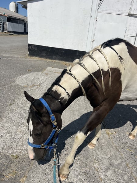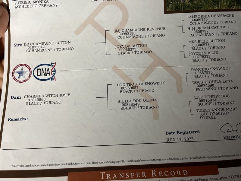 For sale is the 2023-born Paint Horse gelding BUTTONS JIMBEAM (out of DD CHAMPAGNE BUTTON x CHARMED WITCH JOSIE), affectionately known as "JOE." Joe has been in my possession since he was one year old, and I can honestly say he is the most relaxed and friendly young horse I have ever met. He came to me through a roundabout route and was initially only supposed to stay temporarily. Later, I decided to keep him until he is three years old to find him a suitable home. I am only offering this handsome fellow because he does not suit my personal ambitions (nor will he), and I already have two fantastic, calm all-rounders at home! Here are some details about JOE: - He has always been healthy - Regularly dewormed and vaccinated - Regular hoof care - Receives good mineral and supplement feed - Experienced in herd life (mixed herd) as well as box stall with turnout - Extremely social, gets along with all horses, very playful - Has been on pony rides - Knows walking out on a lead - Familiar with ground work (free in round pen, lunging, pole work, double lunging) - Is familiar with a saddle - Can carry rider’s weight with and without a saddle - Has been ridden properly only three times so far; mostly just sat on, mounted, dismounted, etc. - Very gentle with children - Knows dogs, cats, chickens, cows, sheep - Well-prepared for a future as a riding horse - Has experience with desensitization work - Absolutely not spooky; familiar with various farm machinery, tractors, leaf blowers, trucks, etc. - Stands well, well-muscled but still growing - No health certificate (AKU) available - Has been transported in a trailer from stable to pasture and from previous stable to me - Holds APHA papers, equine passport, and transfer report My wish is for Joe to find a truly ideal home. I cannot predict whether he will be suitable for sport, as he has no limitations, and with proper training and patience, he will likely develop into a very talented horse. I see him suited for trail riding, horsemanship, pleasure riding, ranch work, or as a family and leisure horse. He is very familiar with cows from our farm but shows no cow-sense or particular interest in them. I prefer him to be kept in herd or box with turnout (together with other horses), as he loves to play and can get bored quickly otherwise. He is a very laid-back horse with little "go," but he is always interested and fully engaged when working. He loves outdoor riding and is a real asset in the terrain. More information gladly via private message or WhatsApp at +49 163 7829 753. In the last photos, you can see Joe with his mother, CHARMED WITCH JOSIE, and in another photo, his sire, DD CHAMPAGNE BUTTON. In the picture where a second Paint Horse gelding is nose-to-nose with Joe, you see his half-brother JACK, who was also in training with me (and will return) and possesses equally good qualities as my JOE!