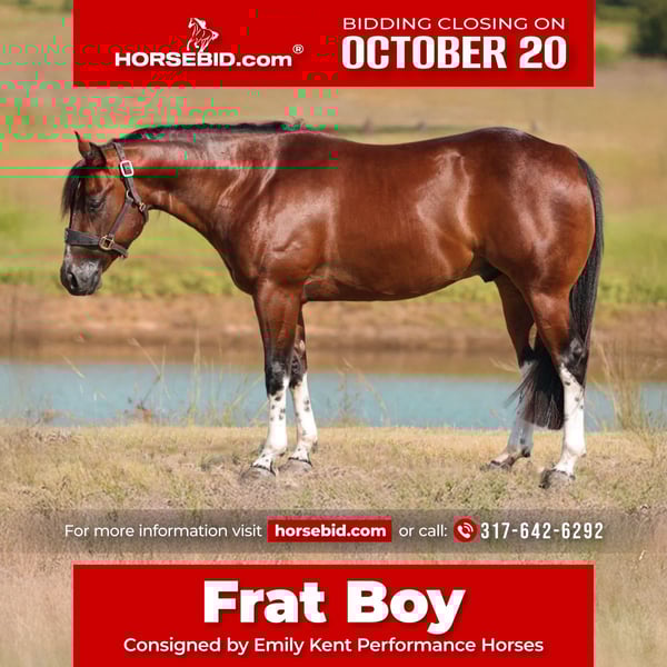♦️ 𝐭𝐡𝐞 𝐀𝐌𝐄𝐑𝐈𝐂𝐀𝐍 𝓕𝓪𝓵𝓵 𝓒𝓵𝓪𝓼𝓼𝓲𝓬 ♦️ Happening now thru MONDAY | OCTOBER 20th - Available EXCLUSIVELY on HorseBid's website! For more details and to register visit: www.Horsebid.com CONSIGNOR CONTACT: Emily Kent Performance Horses 317-642-6292 LOCATION: Jacksboro TX BREED: APHA REGISTERED: Yes REGISTERED NAME: Lone Dakota Bourbon COLOR: Bay Tobiano HEIGHT: 14.1 AGE: 3 GENDER: Gelding ✨Frat Boy – 3-Year-Old Gelding✨ Frat Boy has looks that could kill and the talent to match. At just three years old, he’s already proving himself as a versatile reining/rope horse prospect with the ability to go in any direction. This stunning gelding stands out with his striking polkadots, YES, we said polkadots!! Frat Boy is truly a jack of all trades – stylish, athletic, and willing. He’s an easy keeper with the kind of mind and build that make him both fun to ride and simple to maintain. Whether you’re looking for a show pen partner or a horse with the foundation to take into multiple disciplines, Frat Boy checks every box. Frat Boy loads, bathes, ties, stands for the farrier, is up to date on vaccinations, teeth, coggins, etc. This awesome gelding has been hauled to shows and is currently in Fort Worth Texas at the NRCHA Snaffle Bit Futurity under the bright lights of Fort Worth! Don’t miss your chance at owning this exceptional gelding! He’s got presence, the talent, and the brains – he’s got it all. Contact Emily Kent Performance Horses with any questions 317-642-6292
