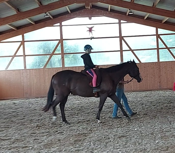 PRÊT À COMMENCER „RCR Black Jack“ vient d'avoir 4 ans, un prometteur hongre Paint Horse (APHA) de couleur spéciale smoky black overo (a/a, E/e, nd2/nd2, CR/n, LWO/n). Blacky a des nerfs d'acier, est curieux, a toujours la volonté de plaire et est très attaché aux humains. Lorsqu'il fait confiance à son humain, il est prêt à tout pour lui. Dans toutes les situations quotidiennes, il se laisse très bien manipuler, ce qui rend son entretien très simple et agréable. Description : - Hongre Paint Horse, 4 ans, environ 1,51 m de haut, couleur : smoky black overo - Papier APHA et E-Pass - Génétique de santé détaillée via Étalon, test 6 panneaux, profil ADN - Dents fraîchement faites, vacciné et vermifugé régulièrement - Élevé comme cheval polyvalent avec un talent particulier pour les obstacles d'extrême-trail - Formation de base solide : Natural Horsemanship, travail à pied, longe, double longe, désensibilisation. - Connaît le poids du cavalier et les premières étapes sous le cavalier, toujours coopératif et désireux de bien faire - Peut également être manipulé par des enfants - Monte facilement dans le van et voyage également détendu seul dans le van - Reste calme chez le maréchal-ferrant (fer à l'avant) et chez le vétérinaire (vaccination), il n'a jamais été malade ici - Connaît toutes les situations quotidiennes des chevaux comme par exemple être attaché, être brossé, être vermifugé, circulation routière, tracteurs, chiens, etc. - Blacky n’a AUCUN défaut de comportement - Pas de boxe souhaitée ! Vous achetez directement auprès de l'éleveur ! Notre Red Color Ranch est situé dans le sud de la Mecklembourg. Nous élevons ici depuis de nombreuses années des partenaires de loisirs équins agréables, qui sont également intéressants pour le sport. Nous sommes spécialisés dans l'élevage/éducation/formation de poulains et de jeunes chevaux. Tous les chevaux vivent en plein air dans de grands pâturages avec un abri ouvert et sont tous manipulés quotidiennement. Les poulains vivent jusqu'à la maturité sexuelle dans le troupeau de juments, puis les étalons sont transférés dans un groupe de hongres. Les juments restent dans le troupeau d'origine. Ce type d'élevage produit des chevaux bien socialisés qui ont l'esprit clair. Dans le cadre de leur manipulation quotidienne, les poulains apprennent déjà à être attachés, à être conduits, à donner leurs sabots et à voir le maréchal-ferrant. Ce n'est qu'à trois ans que la préparation détaillée pour devenir cheval de selle commence et la formation peut débuter au plus tôt à quatre ans. Une AKU peut être commandée à vos frais. Merci de votre compréhension, les demandes écrites ne seront pas répondues pour des raisons de temps. Si vous êtes intéressé, appelez simplement le 0174 9701525.