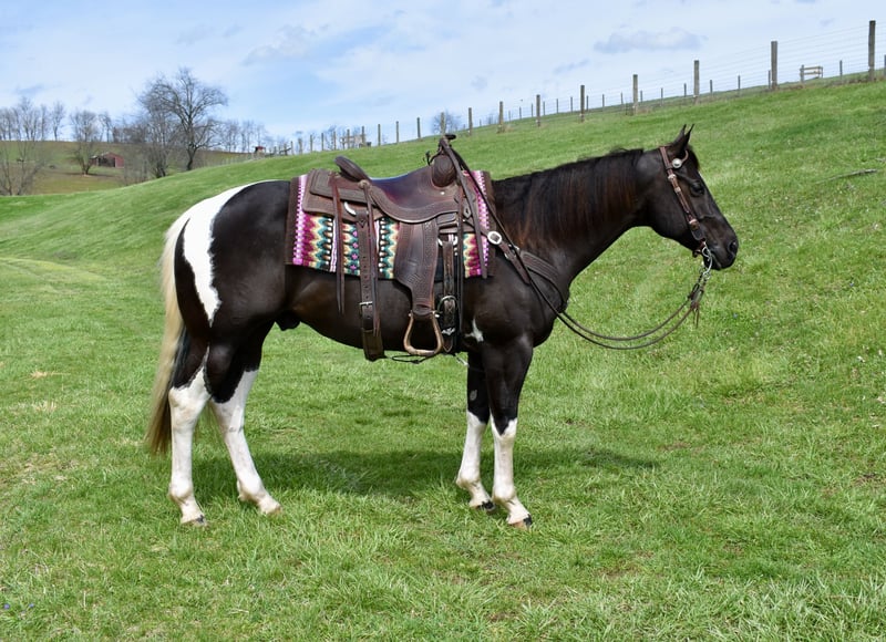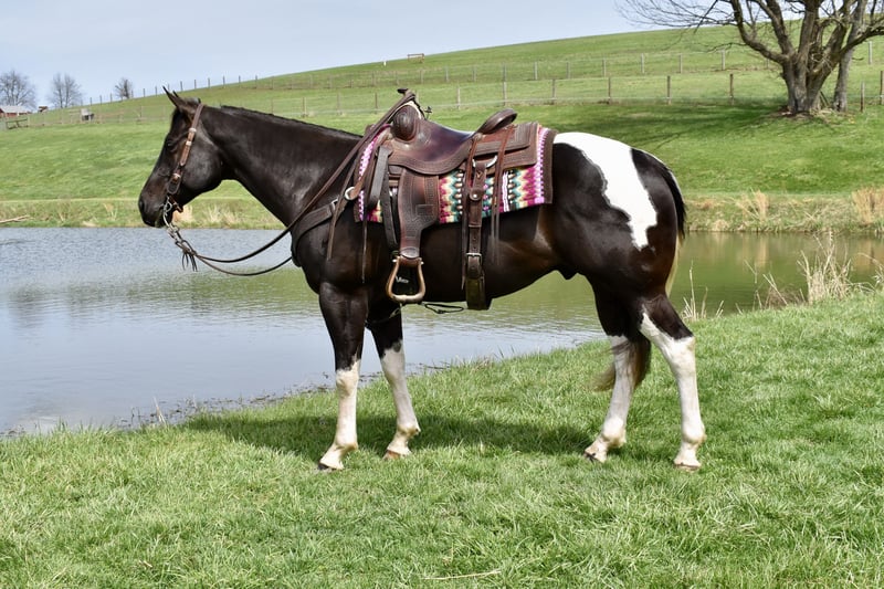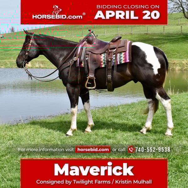 ⚜️𝐭𝐡𝐞 𝓔𝓵𝓲𝓽𝓮 𝐒𝐩𝐫𝐢𝐧𝐠 𝐂𝐥𝐚𝐬𝐬𝐢𝐜⚜️ Happening now thru MONDAY | APRIL 20th - Available EXCLUSIVELY on HorseBid's website! For more details and to register visit: www.Horsebid.com CONSIGNOR CONTACT: Twilight Farms / Kristin Mulhall 740-552-9538 LOCATION: Fresno, OH BREED: Paint REGISTERED: No REGISTERED NAME: Maverick COLOR: Black and White HEIGHT: 14.3 AGE: 5 GENDER: Gelding Maverick is a striking 5-year-old nearly black and white gelding standing just under 15 hands, offering the perfect blend of eye appeal, athleticism, and a solid foundation. He is the type that grabs your attention immediately with his sharp looks and confident presence, yet he remains sensible, willing, and enjoyable to have around every day. Under saddle, Maverick is well broke with a soft feel in the bridle and a responsive, willing attitude. He works comfortably off leg and rein, has smooth transitions, and carries himself naturally with a balanced and attractive headset—making him especially enjoyable for English riding. He is also comfortable and user-friendly, giving his rider a confident and enjoyable experience each time in the saddle. Maverick has even been ridden bridleless, demonstrating the level of training, trust, and connection he has with his rider. Maverick has not been limited to arena work—he has been brought along the right way with consistent exposure to real-life situations. He has been extensively trail ridden through the summer and fall, and throughout the winter he has stayed in steady work with arena rides and driving miles when weather allowed. He is very well started to drive and handles himself confidently both in harness and under saddle. Out on the road, Maverick is traffic safe and takes everyday activity in stride. Whether riding down the road or driving, he remains level-headed and confident, proving himself to be a practical and versatile horse that can step into a variety of programs. Adding even more value, Maverick is as fun as he is functional. He is trick trained and knows how to lay down and sit on a bean bag, making him a standout with personality and something the whole family can enjoy. Maverick is up to date on deworming, vaccinations, dental care, and farrier, and he has a current Coggins. He is a well-rounded gelding with the looks, training, and versatility that make him a standout in any program. Please Note: Photos showing Maverick as a faded brown were taken in February shortly after he was body clipped. His current conformation photos, taken April 2nd, accurately reflect his true dark coloring.