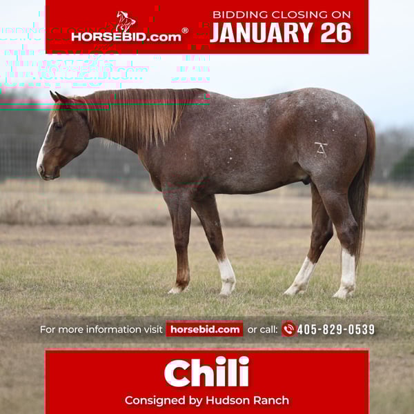 𝐉𝐀𝐍𝐔𝐀𝐑𝐘 ⭐️𝑨𝒍𝒍 𝑺𝒕𝒂𝒓 𝑳𝒊𝒏𝒆𝒖𝒑⭐️ Happening now thru MONDAY | JANUARY 26th - Available EXCLUSIVELY on HorseBid's website! For more details and to register visit: www.Horsebid.com CONSIGNOR CONTACT: Hudson Ranch 405-829-0539 LOCATION: Burleson, TX BREED: Apha REGISTERED: Yes REGISTERED NAME: Spooncatz Red Quejana COLOR: Roan HEIGHT: 14.3 AGE: 5 GENDER: Gelding Chili is a 5 year old gelding by catzanne he stands 14.3 weighing 1100 lbs. he has been used extensively for all aspects of ranch work. He picks up his leads both ways, spins, stops, has been used to gather and work cattle and has had cutting training and is started roping. Chili is very gentle and good minded you can ride him daily or give him the weekend off and he rides the same. He stands for the farrier, loads and unloads from the trailer and is easy to catch. He has a sweet disposition. And is a great performance horse prospect .