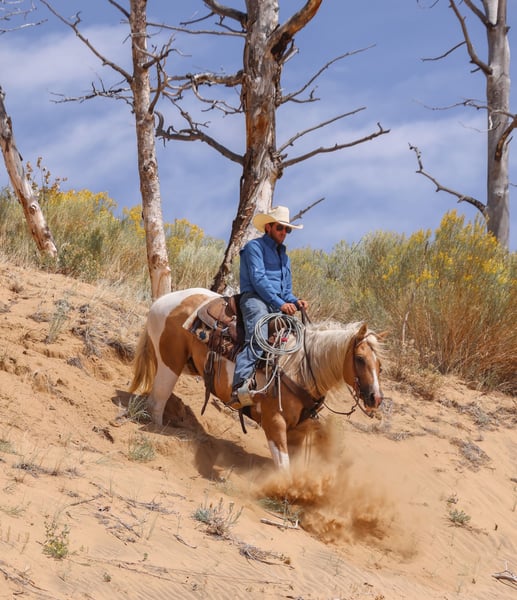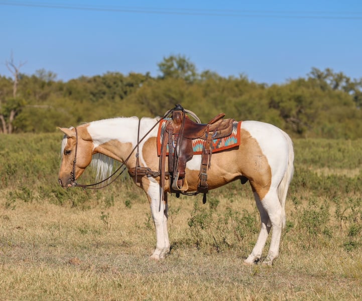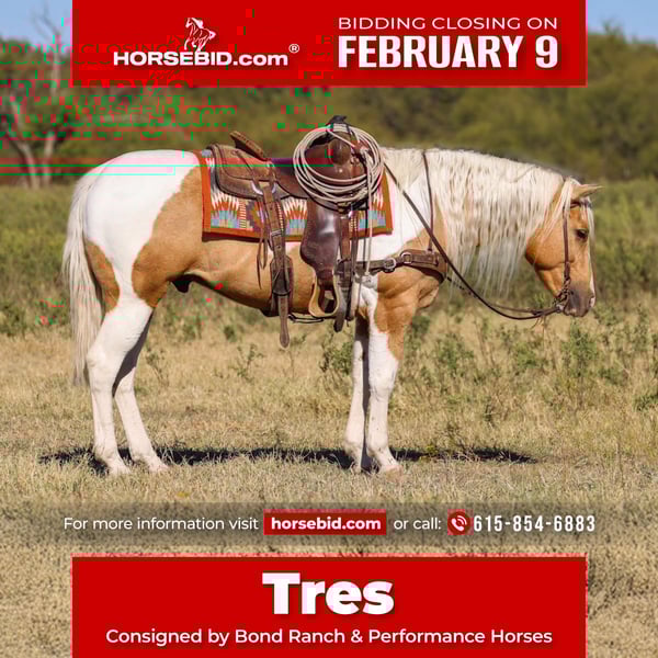 ❤️🔥𝑩𝒆 𝑴𝒊𝒏𝒆 𝐒𝐄𝐋𝐄𝐂𝐓❤️🔥 Happening now thru MONDAY | FEBRUARY 9th - Available EXCLUSIVELY on HorseBid's website! For more details and to register visit: www.Horsebid.com CONSIGNOR CONTACT: Bond Ranch & Performance Horses 615-854-6883 LOCATION: Ranger, TX BREED: American Paint Horse REGISTERED: Yes REGISTERED NAME: Dans Cracker Jack COLOR: Palomino Paint HEIGHT: 14.2 AGE: 6 GENDER: Gelding If you’re looking for one that’ll make you grin every time you saddle up, meet Tres! A 6 year old APHA gelding sired by Freckled Bobcat, out of Cowgirls Sunshine Bar. He’s the kind of gelding everyone in the family can enjoy — broke, kind, and steady as the day is long. The definition of versatility: a true ranch partner, an up-and-coming heel horse, and the kind of steady soul you can trust with your best day or your greenest rider. Standing 14.2 hands, Tres is built right — compact, athletic, and pretty as a desert sunrise. He’s earned his keep doing the kind of work that makes a horse solid from the inside out: long days gathering rough country, sorting pairs, dragging calves to the fire, and doctoring yearlings. There’s no job too big or small for this young gelding — the kind of resume that’d make most horses blush. When it comes to the arena, Tres has talent to burn. He’s a natural on the heel side — quiet in the box, smooth across the pen, and deep in the stop. He reads cattle with confidence, rates naturally, and carries the perfect mix of cow sense and composure to go far. Handy enough for ranch horse classes, fancy enough for versatility, and quiet enough for the whole family. Always gentle and forgiving, Tres meets every rider right where they are — whether you’re a seasoned cowboy or just getting started. Ride him bareback, bridleless, or double; Tres handles everything with quiet confidence and a big heart. He’s been used for mounted shooting, carried flags, and seen more of the great outdoors than most people. Sure-footed, confident, and careful in steep, rough country — the kind of trail partner you can trust when the going gets tough. From mountain trails to the show pen, this gelding does it all with style and try. Honest, handy, and downright handsome! Tres will make you proud to call him yours! Tres has clean X-Rays on file and is up-to-date on deworming, farrier and dental work. For additional information, questions or to schedule a time to meet Tres please call or text Morgan at 615-854-6883.