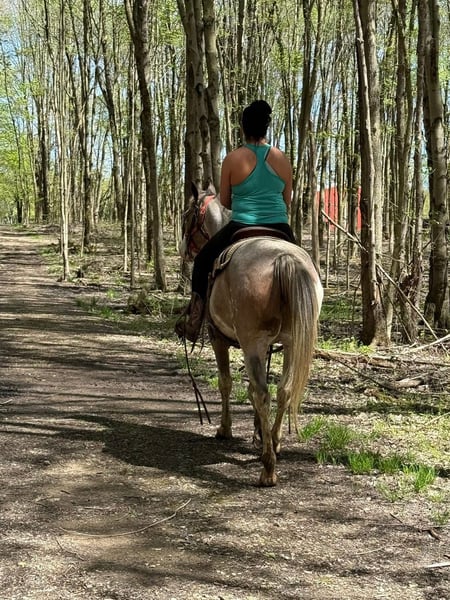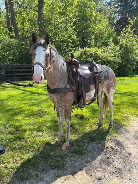 "AVAILABLE ON ONLINE HORSE AUCTION AT www DOT MagicHorseAuction DOT com BIDDING OPEN NOW thru TUESDAY | October 14TH! - BUY IT NOW AVAILABLE! *Final price will be determined on auction site* CONSIGNOR CONTACT INFO: McKenzie Cramer 330-307-0323 LOCATION: Mantua, OH "Rambo" is a 5 yr old Sabino crossbred gelding that stands a stout 15.1 hands tall. He is well started and has been trail ridden and ridden in the arena. Lopes circles both ways, has a good stop, side passes and backs up. A nice young gelding with a bright future. He needs a job and is ready and willing to work for you.