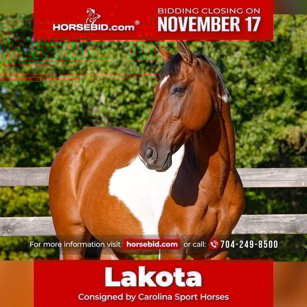 🎲𝓽𝓱𝓮 𝐑𝐈𝐃𝐄𝐑'𝐒 𝓒𝓱𝓸𝓲𝓬𝓮🎲 Happening now thru MONDAY | NOVEMBER 17th - Available EXCLUSIVELY on HorseBid's website! For more details and to register visit: www.Horsebid.com CONSIGNOR CONTACT: Carolina Sport Horses 704-249-8500 LOCATION: Clover SC BREED: Paint X QH REGISTERED: No REGISTERED NAME: Lakota COLOR: Tri-Color Paint HEIGHT: 15.2 AGE: 5 GENDER: Gelding Meet Lakota, a 5-year-old Paint Draft cross gelding whose beauty is every bit as special as his temperament. With one of the most unique and eye-catching coats we’ve ever offered, Lakota is the definition of a stand-out horse — a striking partner who turns heads wherever he goes, and keeps his rider smiling every step of the way. Lakota’s happy place is outside the arena. He’s a true trail master — confident, surefooted, and calm in any setting. Whether you’re exploring new countryside, crossing water, or riding through open fields, he stays relaxed and willing. He would also excel in the hunt field or make a remarkable addition to any family trail program. Under saddle, Lakota offers a smooth, balanced ride with an easy handle and responsive feel. He’s light to the aids, fun to ride, and steady enough for all ages — riders as young as nine school him weekly. He’s also been schooled extensively in groundwork and round-pen exercises, giving him a well-rounded education and a deep sense of connection with his handler. In the barn, Lakota is every bit the gentle giant — quiet, kind, and easy to be around. He enjoys people and gets along with any horse in the herd. He thrives with a rider who enjoys building a relationship through touch and trust, making him a perfect partner for those who value connection as much as performance. Beautiful, trainable, and endlessly kind — Lakota checks every box for the rider who wants a dependable trail companion, a safe family horse, or a versatile partner with unmistakable style. His combination of color, calmness, and character make him a one-of-a-kind opportunity for the right home. *All of our descriptions are OUR OPINION and ARE NOT FACTS. They represent how the horse responded and behaved while in our care. Horses can change at any time as they are living, breathing animals. There are no warranties expressed or implied via the descriptions above*PLEASE READ OUR BUYERS GUIDE PRIOR TO BUYING OR BIDDING ON ANY HORSE WE HAVE AVAILABLE.