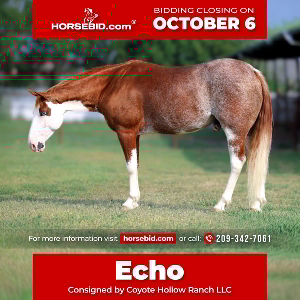 🍂 𝓐𝓾𝓽𝓾𝓶𝓷 𝑨𝑳𝑳 𝑺𝑻𝑨𝑹 𝑳𝑰𝑵𝑬𝑼𝑷 🍂 Happening now thru MONDAY | OCTOBER 6th - Available EXCLUSIVELY on HorseBid's website! For more details and to register visit: www.Horsebid.com CONSIGNOR CONTACT: Coyote Hollow Ranch LLC 209-342-7061 LOCATION: Mount Vernon TX BREED: Paint COLOR: Red and white paint HEIGHT: 14 AGE: 7 GENDER: Gelding Meet Echo, a beautiful, versatile gelding that truly checks every box for a family horse. Standing the perfect size and built to last, Echo is gentle, kind, and reliable, making him safe for kids, guests, or anyone wanting to enjoy time in the saddle. He’s the type that stays broke and honest even with time off—always the same horse every time you catch him. Echo has been ridden both English and Western, giving him a well-rounded foundation that makes him fun and versatile. He’s been started over small jumps and is confident navigating obstacles, as well as sure-footed and steady in the toughest mountain terrain. From crossing streams to climbing rocky trails, he handles it all with a calm, willing attitude. On the ranch, Echo has done a day’s work and knows what a hard job looks like. He’s been used to doctor yearlings outside, making him handy when needed, but quiet enough to slow things down for the whole family. This gelding is as easy to handle on the ground as he is under saddle. He’s good to bathe, groom, load, haul, and tie, always respectful and mannerly. With his kind disposition, solid training, and proven experience, Echo is the horse you’ll be proud to own and trust to carry anyone in your family—whether it’s around the ranch, in the arena, or out on the trail.