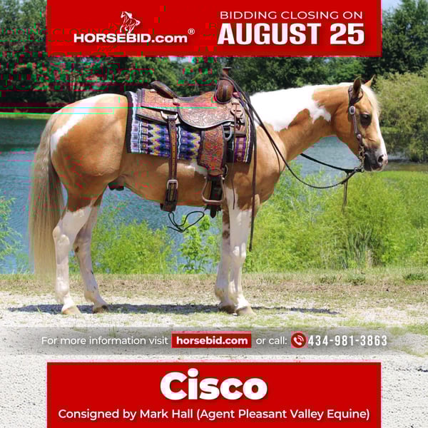 ⭐️ 𝐀𝐔𝐆𝐔𝐒𝐓 𝓐𝓵𝓵 𝓢𝓽𝓪𝓻 𝓛𝓲𝓷𝓮𝓾𝓹 ⭐️ Happening now thru MONDAY | AUGUST 25th - Available EXCLUSIVELY on HorseBid's website! For more details and to register visit: www.Horsebid.com CONSIGNOR CONTACT: Mark Hall (Agent Pleasant Valley Equine) 434-981-3863 LOCATION: Robards, Ky BREED: Paint REGISTERED: Yes REGISTERED NAME: Spots Light Cash COLOR: Palomino Tobiano HEIGHT: 14.3 AGE: 8 GENDER: Gelding Here’s an opportunity to own a horse that will be nearly impossible to replicate. Spot Light Cash aka “Cisco” is a gorgeous 8-year-old gelding by the great CD Lights. His sire needs no introduction as one of the greats whose offspring has earned more than 2 million dollars in the cowhorse events. “Cisco” has a strong bottom side of his pedigree as well being out of an own daughter of Nu Chex To Cash who is also a 2 million dollar sire. With his color and elegance, you may as well call him one-of-a-kind. Gelding like him do not become available often. We are selling "Cisco" for a customer that bought another horse better suited for their needs. “Cisco” stands 14.3 hands tall and has a stocky, balanced build. He has the cutest expression and has little bitty mouse ears. Saddle him up and you have a wonderful partner you can take in any direction. He walks, trots, and lopes circles in the arena. Cisco has the smoothest, little jog & a rocking chair lope. Lay the bridle reins across his neck and he’ll wrap into a nice little turnaround. He’ll also strike out on trail crossing logs, roads, ditches, etc. He’s athletic enough to make an excellent sorter, rope horse, ranch horse or barrel prospect. Once he belongs to you, the sky is the limit for what you’ll be able to accomplish together. "Cisco" has no vices UTD on vaccinations, Coggins & Dental. Call today to meet "Cisco".