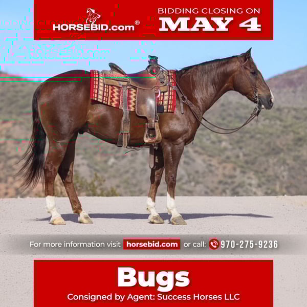 ▪️▫️◾️𝐭𝐡𝐞 𝑴𝒂𝒚 𝐒𝐞𝐥𝐞𝐜𝐭◾️▫️▪️ Happening now thru MONDAY | MAY 4th - Available EXCLUSIVELY on HorseBid's website! For more details and to register visit: www.Horsebid.com CONSIGNOR CONTACT: Agent: Success Horses LLC 970-275-9236 LOCATION: Casa Grande, AZ BREED: Quarter Horse REGISTERED: Yes REGISTERED NAME: Bugs Snowin Hickory COLOR: Chestnut HEIGHT: 15 AGE: 8 GENDER: Gelding Meet Bugs Snowin Hickory lovingly known as “Bugs “ a solid 8-year-old registered solid APHA gelding with a lifetime of real ranch experience. This is the kind of horse that’s been there and done that—raised and used on the ranch his entire life, making him dependable, level-headed, and ready to go to work. Bugs is safe and reliable out on the trails. He handles new environments with ease and has a calm, steady demeanor that makes him a pleasure to ride whether you’re out checking cattle or just enjoying a quiet ride. In the arena, Bugs is broke and responsive with a good foundation. He’s started in the heeling and showing great potential—making him a nice prospect for someone looking to finish out a solid rope horse. Highlights: * 8-year-old registered APHA gelding * Ranch-raised and experienced * Safe and trustworthy on the trails * Solid in the arena * Started in the heeling * Gentle, willing, and easy to get along with Bugs would make a great addition to any ranch, rope pen, or recreational home. He’s the kind that’s hard to find—honest, experienced, and ready for his next job.