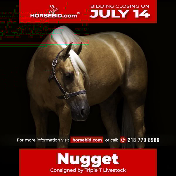 ♦️ MID-SUMMER SHOWCASE ♦️ Happening now thru MONDAY | JULY 14TH - Available EXCLUSIVELY on HorseBid's website! For more details and to register visit: www.Horsebid.com CONSIGNOR CONTACT: Triple T Livestock 218 770 8986 LOCATION: Nevis MN BREED: APHA REGISTERED: Yes REGISTERED NAME: Dunitwithasmartchic COLOR: Palomino HEIGHT: 15 AGE: 8 GENDER: Gelding Nugget is a striking golden palomino gelding that shines just as bright in the arena as he does out on the trail. Standing a solid and balanced 15 hands, he is the perfect size for both youth and adults, and his charming personality makes him instantly likable. Nugget is incredibly kind, the type of horse that meets you at the gate with a soft eye and an eager heart. He is gentle to be around, easy to handle, and truly enjoys being someone’s partner, whether it’s for a casual ride or a competitive outing. Under saddle, Nugget is impeccably trained and a true pleasure to ride. He performs all the reining maneuvers with style and correctness—he spins with cadence, has a big stop, and circles with fluidity and collection. His lope departures are smooth and effortless, and his body control is exceptional. He’s light in the bridle, rides off your seat and legs, and responds with softness and willingness. Nugget makes it easy for his rider to look good, and his training sets him apart as a mount capable of excelling in the show pen or stepping into any performance direction. Outside the arena, Nugget proves just how versatile he is. He is a confident, steady partner on the trail, surefooted and willing to go anywhere you point him. Whether it’s crossing water, navigating steep terrain, or riding through town, Nugget takes it all in stride. He’s accustomed to dogs, pigs, bicycles, traffic, tarps, and all the chaos that comes with life on a busy ranch. Nothing rattles this gelding—he’s been there, done that, and is always game for more. With his combination of looks, talent, and temperament, Nugget is the kind of horse that’s hard to find. He would truly shine in ranch versatility events, trail classes, 4H shows, or simply as a dependable partner for everyday riding. Whether you’re a competitive rider looking for a fun and capable show horse or a family needing a reliable, gentle gelding, Nugget checks all the boxes. He is as sweet as he is talented, and he’s ready to make someone very proud.