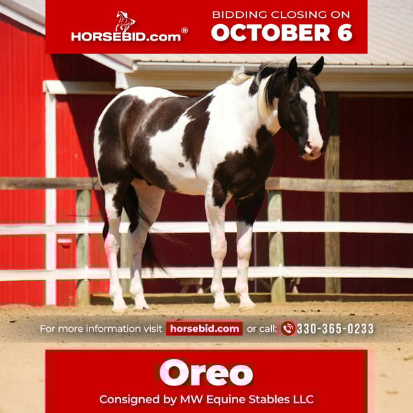 🍂 𝓐𝓾𝓽𝓾𝓶𝓷 𝑨𝑳𝑳 𝑺𝑻𝑨𝑹 𝑳𝑰𝑵𝑬𝑼𝑷 🍂 Happening now thru MONDAY | OCTOBER 6th - Available EXCLUSIVELY on HorseBid's website! For more details and to register visit: www.Horsebid.com CONSIGNOR CONTACT: MW Equine Stables LLC 330-365-0233 LOCATION: Fresno, OH BREED: Paint REGISTERED: No COLOR: Black & White HEIGHT: 15.1 AGE: 7 GENDER: Gelding 💥Oreo is a 7 yr old paint gelding that with the best color and conformation ever.. This guy stands 15.1 HH and is an absolute Sweetheart.. Super Versatile, Rides English,Western, amazing trail horse.. and could excell as an amazing Hunter Jumper.. Oreo is the perfect babysitter for the whole family. Whether it’s the grandkids or beginner riders, he’s the one you can trust. In the barn, Oreo is as sweet and gentle as they come. He’s quiet to handle, stands nicely for grooming, and gets along with all the farm life — dogs, kids, you name it. Under saddle, he’s dependable and uncomplicated, safe for any level of rider. He’s trail-savvy, willingly crossing logs, creeks, ditches, and navigating any obstacle without hesitation. He will walk, trot, and canter effortless circles, but his happy place is strolling steadily down the trail, carrying his rider with confidence and care. Well-build, beautifully marked, and flashy, Oreo turns heads wherever he goes. He’s clean, sound, and vice-free, plus easy to shoe, load, and haul. If you’re looking for a fun, willing, and trustworthy gelding who’s as pretty as he is kind, Oreo is ready to be your family’s favorite. ☎️ Contact Marcus for more info 330-365-0233