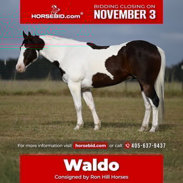 ⚜️𝐓𝐇𝐄 𝐅𝐀𝐋𝐋 𝐇𝐄𝐑𝐈𝐓𝐀𝐆𝐄 𝐂𝐋𝐀𝐒𝐒𝐈𝐂⚜️ Happening now thru MONDAY | NOVEMBER 3rd - Available EXCLUSIVELY on HorseBid's website! For more details and to register visit: www.Horsebid.com CONSIGNOR CONTACT: RON HILL HORSES 405-637-9437 LOCATION: Mount Vernon TX BREED: American paint REGISTERED: No COLOR: Black and white HEIGHT: 15.2 AGE: 7 GENDER: Gelding Waldo – 7-Year-Old Black & White Paint Gelding Waldo is the kind that’s seen the miles and knows his job. This 7-year-old black and white paint gelding has spent plenty of time out on the trails and in the pasture, and he’s solid everywhere you take him. He’s sure-footed, confident, and dependable, whether you’re riding out alone or covering country with a crew. He’s also been used to doctor yearlings outside, and handles a rope and cattle with ease. The same horse every day, Waldo is all business when it’s time to work but easy to have around. Good to saddle, load, tie, and bathe, and ready to go to work or hit the trails tomorrow. Waldo’s broke, seasoned, and ready for whatever job you’ve got in mind.