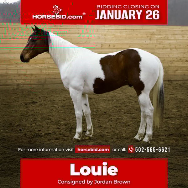 𝐉𝐀𝐍𝐔𝐀𝐑𝐘 ⭐️𝑨𝒍𝒍 𝑺𝒕𝒂𝒓 𝑳𝒊𝒏𝒆𝒖𝒑⭐️ Happening now thru MONDAY | JANUARY 26th - Available EXCLUSIVELY on HorseBid's website! For more details and to register visit: www.Horsebid.com CONSIGNOR CONTACT: Jordan Brown 502-565-6621 LOCATION: Georgetown, TX BREED: APHA REGISTERED: Yes REGISTERED NAME: TONIS CURLY TOP COLOR: Paint HEIGHT: 15.3 AGE: 8 GENDER: Gelding This splash of color and charismatic charm is just what you’re missing in your life! If you are searching for a fun and friendly gelding who’s down for any task you can drum up, Louie is your guy! The first to greet you at the gate, any time of day or night and always eager to be a part of the adventure whether it’s at home or hauling out. Standing a sturdy 15.3 he has plenty of body to accommodate any size rider and an adaptable mind to calibrate to his passengers youth to adult. Louie has a very universal education spanning across numerous disciplines offering the unique opportunity to own a jack of all trades kind of horse! Started as a ranch/rope horse he is no stranger to a hard day’s work and welcomes the prospect of many miles under saddle. Accustomed to an array of ranch chores including yet not limited to; trotting fences, gathering, sorting, stripping, shipping, and doctoring cattle. He is fluent in being saddled early and trotting out on brisk mornings, covering various terrain, encountering wildlife,navigating obstructions, opening and closing gates, and being expected to handle any circumstance with poise. A grand benefit being that this guy is used to being hauled all over (from Montana to Texas) and travels like the seasoned professional he is! He is an absolute superstar in the roping pen nearly finished on the head side suited for a confident roper to match his stride! Enjoys roping the sled and has zero vices or quirks to work through! Has even loped through the barrels a handful of times and it is no surprise that he shows promise in that as well. Louie lacks no proper skills in the arena, mind you! He is capable and polished when it comes to loping circles, lead departures, transitions, carriage, and a confident halt. He moves off leg, is reactive to seat and verbal cue, and has a butter-soft mouth. Last but certainly not least Louie has an alter ego from his cowboy clothes… we have been dabbling in low level eventing and his potential knows no limits!! A true gentleman in English tack and hacks around super soft and willing. Lovely lofty trot and a naturally classy way of going. He shows great interest in jumping and is brave and confident over stadium and xc. Safe for a proficient youth or AA to take on under an instructor. So easy to catch he nearly halters himself for you, stands tied quietly, great for farrier, big fan of a good bubble bath, and lives for any attention you can give him! Quite like having an overgrown Labrador around with the exception of respectable manners, of course. No history of lameness, injury, or sickness. Prepurchase welcome at buyers expense. X-rays on hand. UTD on vaccines, dental, farrier, chiro Louie has been a true blessing to have in our barn and we can’t wait to see all the wonderful places he will take his next family! Fantastic home is a must and we encourage you to come try him and let his one of a kind personality speak for itself!