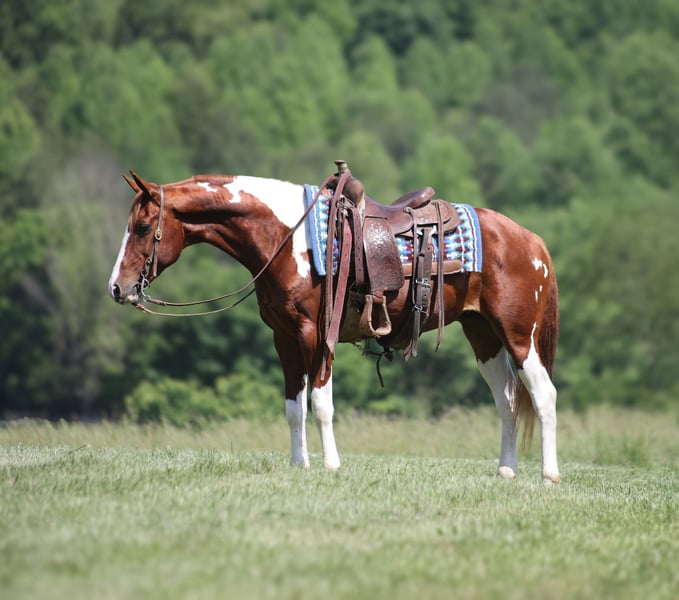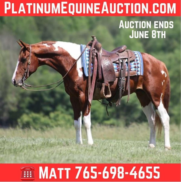 ONLINE AUCTION Place your bids at www.PlatinumEquineAuction.com Starting Bid $3500 Auction ends June 8th, 2025 Need a new saddle? Check out White Rock Saddles on our website or Facebook! Alexander The Great is a beautiful Chestnut Tobiano Paint Quarter Horse Gelding that is standing 14.3hh and he is a 8 years old! Alexander has been ridden on a cow/calf operation and at the feedlot as well. Alexander lopes nice circles, catches the correct leads and has a good stop. Alexander is at home on the trails and nothing phases him! He is content to mosey and loves going on trail rides. He will cross creeks, ditches, logs and navigate rough rocky areas. He has been exposed to all kinds of wildlife and will go anywhere that he is asked too. He has been rode many miles in the mountains and encountered every obstacle possible on the trail. He will go up or down even the steepest slopes, across deep creeks, over downed trees, and over all types of rough terrain while still being sure footed. Alexander has been ridden down the highways and is traffic safe as well. If you want to cruise along down the trails or push cows around the ranch, Alexander the Great is great! If you have any questions, would like to make a Buy It Now Offer or set up a Facetime Call, contact Lucky 13 Equine Matt 765-698-4655 or Lysandra 765-717-2041 Located in Brodhead, KY. ONLINE AUCTION Place your bids at www.PlatinumEquineAuction.com Starting Bid $3500 Auction ends June 8th, 2025 Need a new saddle? Check out White Rock Saddles on our website or Facebook!