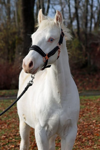 FHB CASH WIMPYS GUN "Ghost" Palomino (maar de palomino is niet zichtbaar omdat zijn maximale witheid zijn hele lichaam bedekt door zijn witte bonting. Bijna een echt eenhoorn zonder hoorn ;) ) Splash en Tobiano (frame overo wordt nog getest) Geboren: 6 mei 2025 Eindhoogte ongeveer 150 cm ee Aa CRcr Tt SW2/N W20/N