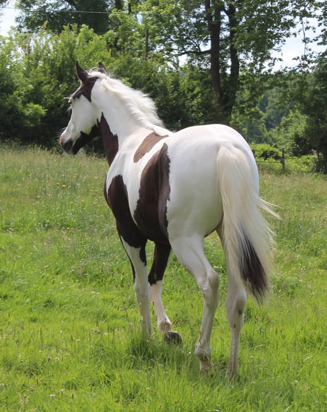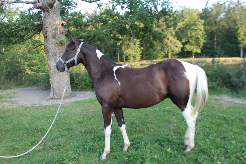 Skip Olena Hancock, männlich, geboren im Juli 2024, PP Tovero, schwarz, hat eine Größe von 155 cm, sehr schöner Kopf. Vater: Django Texas Dream, Abstammung: Texas Rascal. Mutter: Sun Spat Olena, Abstammung: Spat Olena. Sehr gut im Handling, wird im Transporter geritten, Hufpflege, Anbinden, Bürsten usw.