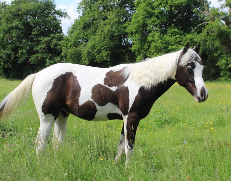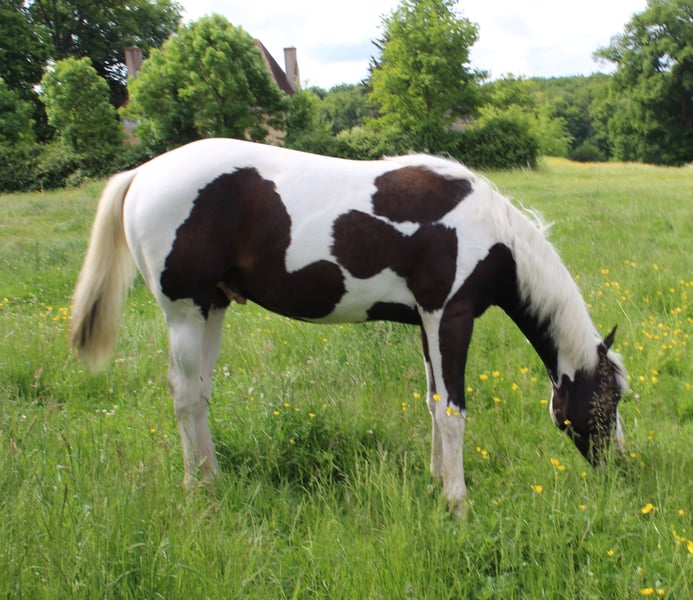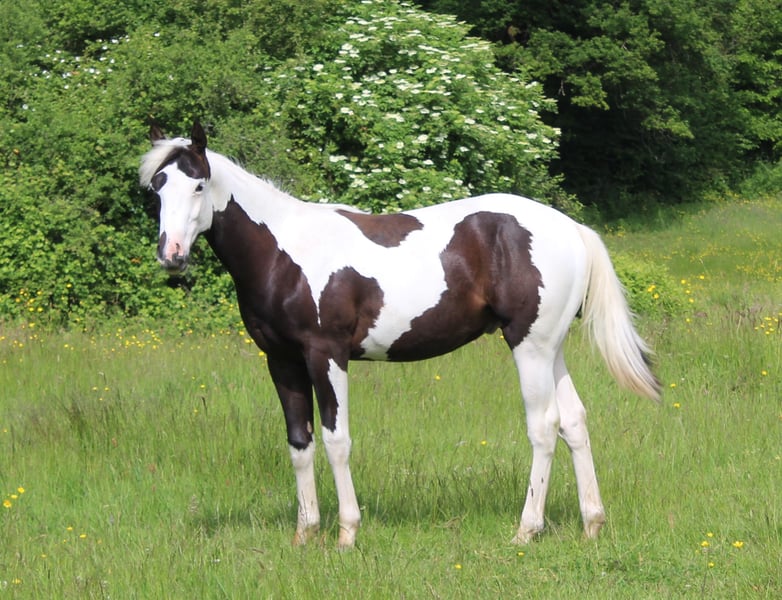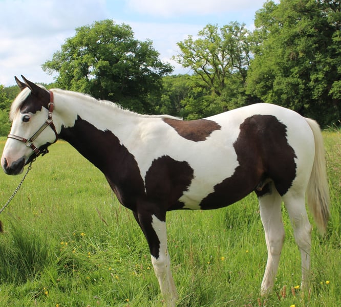 Skip Olena Hancock, caballo de 2024, macho, nacido en julio, con papeles, Tovero, negro con aura de 1.55 m de altura. Cabeza muy bonita. Padre: Django Texas Dream, de origen Texas Rascal. Madre: Sun Spat Olena, de origen Spat Olena. Muy bien manipulado, montado en VANS, con parages, atado, cepillado, etc.
