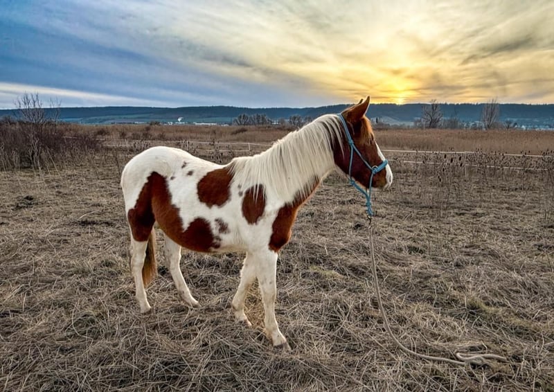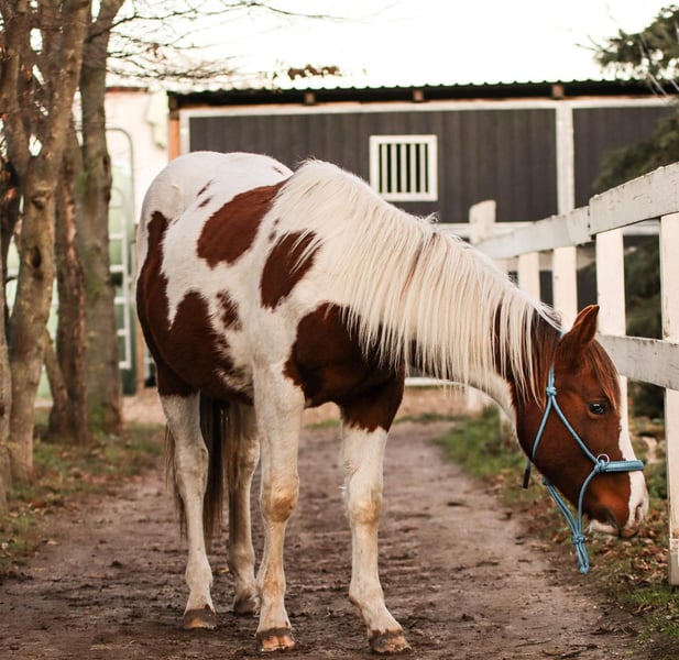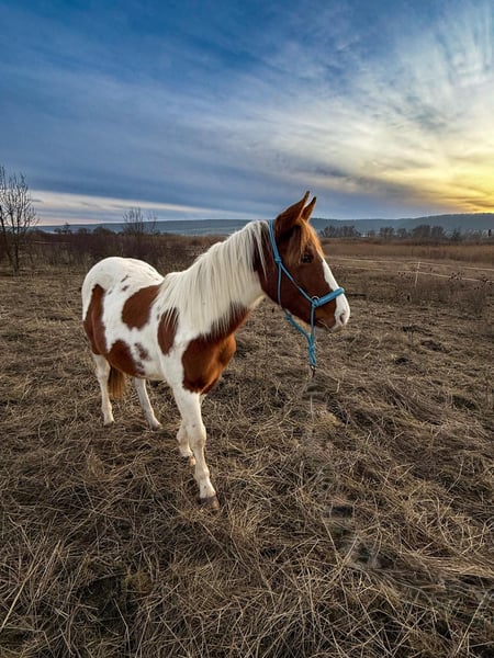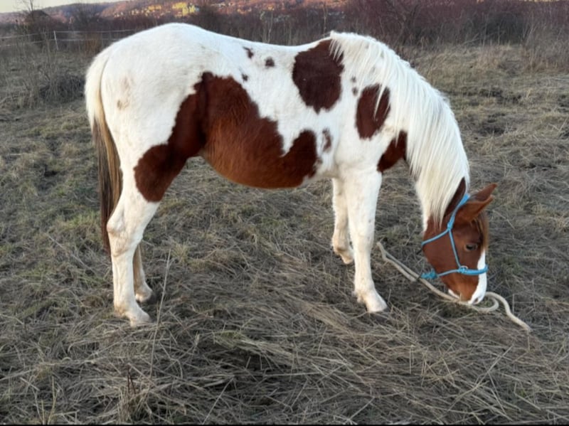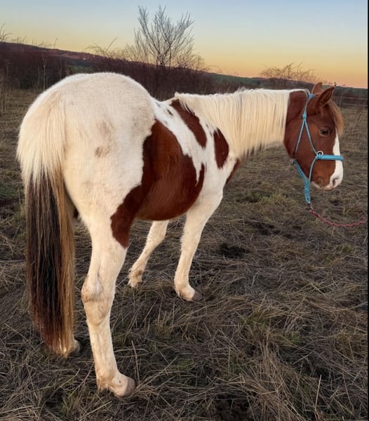 Dieser schöne fast 2 jährige Hengst sucht ein neues Zuhause . Geboren ist er am 13.6.2024. Es ist kein Problem , wenn er im neuen Zuhause gelegt werden soll. Aus eigener Zucht . Farbe Bay . Er wird ca 1,50 bis 1,52 m Stm. groß werden . Der kleine Mann ist kerngesund , er hat APHA Papiere . Über seinen Vater *DANCING BOYS OKIE* und Mutter *KIWAS LITTLE CHEYENNE * ist er tobiano homozygot (vererbt immer seine Scheckung) und 7 - fach Panel negativ . Er hat Reining - und Allround- sowie Cowhorse - Gene . Er wird ein guter Freizzeitpartner werden . Er wäre aber bestimmt auch für den Sport offen . Er kennt Hunde , Katzen und Landmaschinen und zeigt dabei seinen ruhigen Charakter , ist unkompliziert und dem Menschen zugewandt . Er steht im Moment mit seinem 3 Jahre alten Hengst - kumpel zusammen , beide zeigen keinerlei Unarten und sind untereinander ein Herz und eine Seele , auch eine Abgabe beider Jung - Hengste ist also gern möglich . Er wuchs vorher bei seiner Mutter in einer gemischten kleinen Herde auf großen Koppeln auf . Er gibt brav die Hufe , Hänger reingehen und fahren ist kein Problem , er kennt bereits Fellsattel und leichte Gewichte , ist natürlich halfterführig, geimpft , entwurmt . Er ist neugierig und offen , bleibt stets gelassen . Er kann natürlich gern besichtigt werden .