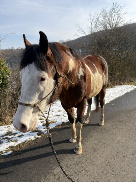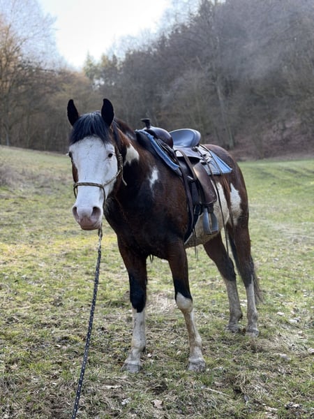 Neues Zuhause für meinen Paint Horse Hengst gesucht, da er in meiner Herde leider nicht akzeptiert wird. Moon wird Ende April 8 Jahre alt und ist knapp 1,50m groß. Er wurde bereits vor ein paar Jahren angeritten, jedoch wurde seine Ausbildung abgebrochen und er stand aus persönlichen Gründen der Vorbesitzer die letzten Jahre nur. Wir schieben ihn nun seit ca. 4 Wochen wieder an. Er wird behutsam an Sattel, Trense, Westernpad, Plane usw gewöhnt. Das macht er super. Er ist sehr fein an den Hilfen und möchte unbedingt lernen und neues erleben. Moon geht am Knotenhalfter entspannt ins Gelände spazieren. Hierbei interessieren ihn weder Radfahrer, noch Autos oder Traktoren. Der Schmied war regelmäßig da und er wurde auch immer entwurmt. Moon hat selbstverständlich einen roten Equidenpass und Paint Horse Papiere. Nachrichtenanfragen bitte nur mit Name und Telefonnummer. Gerne können vorab weitere Fotos und auch Videos gesendet werden. Er kann gerne persönlich kennen gelernt werden. Es besteht die Möglichkeit im Round Pen mit ihm zu arbeiten oder ins Gelände zu laufen. Ein passender Sattel kann bei Interesse gerne mit ausziehen. Wir können ihn uns gut als zuverlässigen Freizeitpartner oder eventuell auch als Deckhengst vorstellen. Privatverkauf