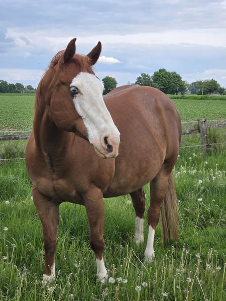 Najla is een geweldige en lieve merrie die hier echter veel te kort komt. Najla heeft op jonge leeftijd een klassieke westernopleiding gekregen, maar is nooit op wedstrijden geweest of verder opgeleid. Ze kan een paar basismanoeuvres, zoals de spin. Maar ik zou haar eerder beschrijven als een goed opgeleide recreatiepaard. Bij ons staat ze in een open stal samen met onze mini-shetlanders, is ze lief in de omgang en goed te rijden. Echter, ze fungeert voornamelijk als maatje voor de mini's en dat is ook de reden voor haar verkoop. Met haar 10 jaar leidt Najla eigenlijk een gepensioneerd leven en dat is gewoon te jammer.... hier moet ik eerlijk en rechtvaardig tegenover het paard zijn en mijn Wendy-bril afzetten. Ze is fit en gezond en kan nog vele jaren een mens echt gelukkig maken en zichzelf natuurlijk ook.... want ook regelmatige beweging is van groot belang voor de gezondheid van het paard. Ik zie Najla eerder als een vrouwenpaard. Ze is rustig en let goed op. Als er van bovenaf geen juiste hulp komt, blijft ze liever staan. In het terrein is ze braaf en gaat ze ook alleen.... maar ook dat is hier helaas veel te kort gekomen. Ze kan echter ook behoorlijk eigenwijs zijn. Bij nieuwe dingen en als ze iets niet leuk vindt, probeert ze eerst haar standpunt duidelijk te maken. Maar als ze eenmaal begrijpt dat deze dingen toch niet zo erg zijn, werkt ze weer goed mee.... eigenlijk een oprecht paard. Najla loopt bij ons op blote voeten en in de winter wordt ze ingepakt. Ze heeft echter een klein mankement. Ze heeft een beetje moeite met haar bronchiën, wat vooral opvalt tijdens het pollenseizoen. In die tijd krijgt ze bij ons inhalaties, maar verder krijgt ze nog geen medicijnen of iets dergelijks.... daarom zou een plek in een open stal wenselijk zijn.... ook al zou Najla zelf liever een boxpaard zijn. Het valt me zwaar om haar af te geven, want ze is mijn persoonlijke droompaard.... maar onder de omstandigheden dat ik haar gewoon niet de aandacht kan geven die ze absoluut verdient, moet je handelen in het belang van het pony en niet andersom. Najla zou bij haar verkoop haar volledige uitrusting meenemen, inclusief een goede merkenzadel. Aangezien dit een verstandige verkoop is en geen noodverkoop, heb ik de tijd om een passend thuis voor haar te vinden. Een goed thuis staat hier op de eerste plaats, daarom is plek belangrijker dan prijs (maar natuurlijk binnen een realistisch kader). Ze kan in overleg op elk moment bekeken worden. En voor verdere vragen sta ik uiteraard graag tot uw beschikking.