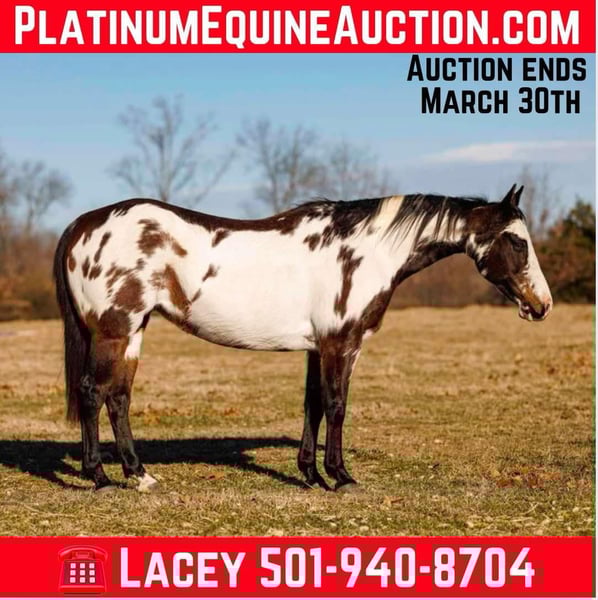 ONLINE AUCTION Place your bids at www.PlatinumEquineAuction.com Starting Bid $3500 Auction ends March 30th, 2025 Need a new saddle? Check out White Rock Saddles on our website or Facebook! Mercedes is an eye catching 13 year old mare with more color than a crayon box! At 14.3 hands she can easily pack anyone, big or small. Along with her drop dead gorgeous color, her good-natured personality radiates wherever she goes and grabs everyone’s attention. Mercedes goes down the trail with a level head and crosses water, logs, ditches and other obstacles with an unfazed attitude. She is easy to catch, groom, saddle, bridle, load and bathe. She also rides bareback and bridle-less! Mercedes is my go-to mount to use at the cow sale penning back, loading trucks and working gates. She has an impressive one-hand neck rein, moves off of leg pressure well and will stay collected when asked. Mercedes doesn’t have the typical mare-ish attitude, she gets along with others in the heard and has a calm, civil disposition. She is made right with clean, straight legs and is sure footed. Mercedes has been rode through town, at the lake, and even made an appearance at the nursing home to visit the residents. Whether you are taking a stroll through town, easing down the trail or putting in a full days work Mercedes is sure to fit the bill and capture your heart! Watch her full Youtube video, feel free to reach out with any questions, and arrange a visit or a FaceTime with Mercedes Contact Lacey Wilf 501-940-8704 Located in Quitman, AR. ONLINE AUCTION Place your bids at www.PlatinumEquineAuction.com Starting Bid $3500 Auction ends March 30th, 2025 Need a new saddle? Check out White Rock Saddles on our website or Facebook!
