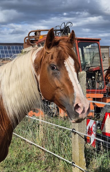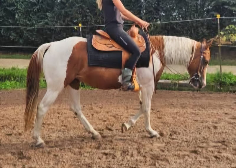 American Paint Horse mare, born 6/2011, Sorrel-Tobiano, approximately 153 cm, 5 Panel N/N, veterinary check from 8/2025 available, with APHA papers. Pedigree: Sire: MHAFreckle Tari Dam: Peponita Chex Star Due to health reasons, I unfortunately have to part with my beautiful mare "Sweet Freckles Pepi." She received a solid basic training as a young horse and has since been ridden almost exclusively in the countryside. She shows herself to be very well-behaved and fearless. In the arena, she is diligent and enjoys working. She has smooth gaits and is very comfortable to ride. In the herd, she is absolutely compatible and low-ranking. She is also very well-behaved and uncomplicated in daily handling.