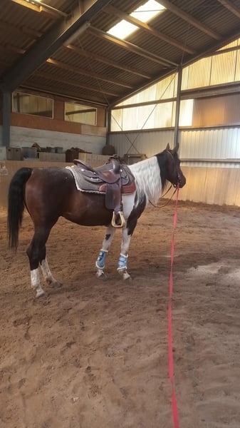 Vends ma belle jument de 14 ans, père Paint Horse, mère Arabe. Taille : 1,53 m Baie tobiano Ce n'est pas une monture pour débutants ! PSSM1, mais sans problème avec une alimentation adaptée et de l'exercice régulier. Elle est plutôt une jument de boxe avec paddock, car assez dominante et peu sociable, sauf si elle trouve le bon compagnon équin. Avec l'humain, elle est très affectueuse. Pucée, régulièrement vermifugée, vaccinée, avec ferrure et soins dentaires effectués. Très calme lors de la ferrure et chez le vétérinaire. Elle peut être la paint cool ou le pur sang arabe fougueux. En manège, elle se laisse bien monter, en extérieur, elle a du tempérament. Elle possède un passeport européen et un certificat de propriété. Ce n’est pas une vente d’urgence, elle sera vendue uniquement si le bon accord est trouvé. Peut être essayée en selle ou testée lors d’une balade. Pour éviter les visites non sérieuses, je facture 30 €, qui seront déduits en cas d’achat.