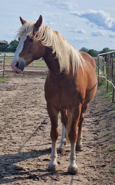 We are selling our lovely mare "Say Yes". Leisure horse, top trail horse. She loves being out in the field. When working in the riding arena, dressage/jumping, she needs a bit more persuasion. We have often thought that perhaps a role in Western riding would suit her better. In handling, she is incredibly sweet; she enjoys being groomed and pampered for hours and has a lot of fun with groundwork. Her occasionally diva-like behavior makes her very endearing. She is conditionally suitable for beginners, as she does not show any bad habits. However, it is conditional because we are generally reluctant to place a horse as a "personal" horse in the hands of beginners who do not yet have sufficient expertise. We can also imagine Jessy well in a therapeutic setting. She would also likely be a good fit as a vaulting horse on a small scale. Due to a lack of opportunities (the inability to ride out from this location), she is somewhat neglected with us, and we cannot meet her needs adequately. Therefore, we would prefer someone who has a particular affinity for trail riding and can better meet her needs. Jessy is kept in a mixed herd in an open stable and shows a rather dominant but not aggressive behavior. Health-wise, we have never had any problems, except for a surgically healed splint bone fracture five years ago. There is one downside: loading is very difficult. Unfortunately, we lacked the time to work on this consistently. However, she does load onto a larger transporter. We have time to find Jessy a good home; this is not an urgent sale.