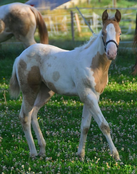 Brezel est homozygote pour Tobiano et Champagne ! Ses poulains seront toujours multicolores et aux couleurs de Champagne. Elle est elle-même un pie doré Champagne Dun. Bien sûr, elle a aussi 7 panels N/N. Elle obtient un passeport et des papiers de l'APHA et du PHCG. Brezel a un œil bleu. C'est une petite briseuse de cœur qui réclame des séances de grattage.