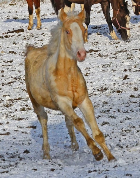 OBNIŻONA DO 01.04. Brezel jest homozygotyczna dla Tobiano i Champagne! Jej źrebięta zawsze będą kolorowe i w kolorze Champagne. Sama jest złotą Champagne Dun sroką. Oczywiście również 7 Panel N/N. Otrzyma paszport i dokumenty od APHA i PHCG. Brezel ma niebieskie oko. Jest małą łamaczką serc, która naprawdę domaga się głaskania.