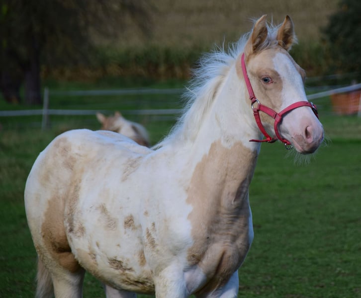 Brezel is homozygous for Tobiano and Champagne! Her foals will always be colorful and Champagne colors. She herself is a Gold Champagne pinto. Of course also 7 panel N/N. She gets passport and papers from the APHA and PHCG. Brezel has a blue eye. She is a little heartbreaker who really demands to be scratched.