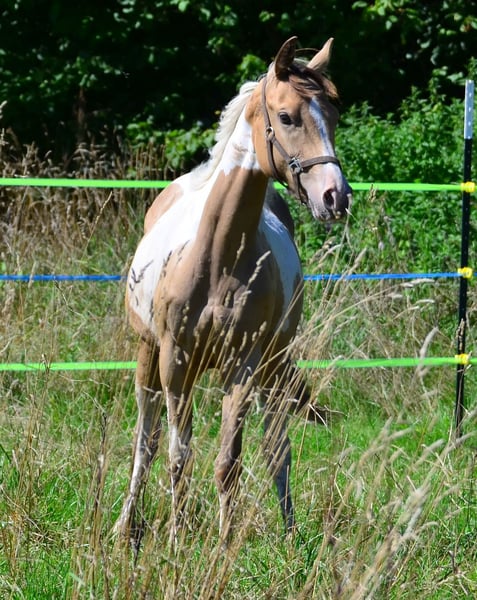 Miral is Amber Champagne, a brilliant mover and a very sweet, gentle nature. She is homozygous for the tobiano gene and will only ever produce colorful foals. She is a Paint Horse with full paper and 7 panel N/N. Grows up here in a species-appropriate manner in a large herd. She will of course be regularly wormed and vaccinated, with papers and passport.