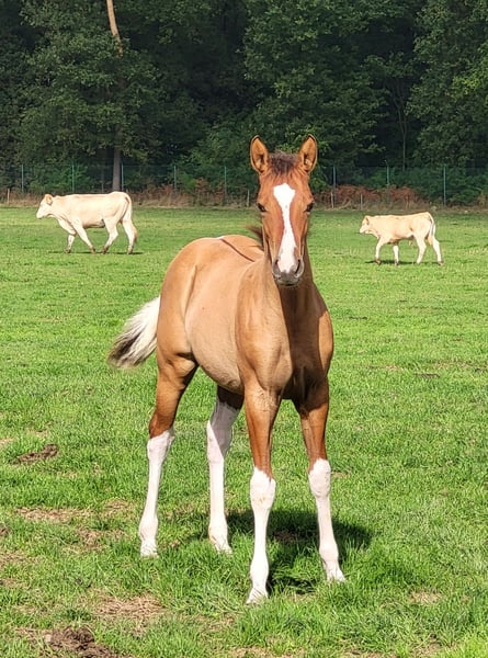 🌾 Lola – betoverend baydun merrieveulen met hart & talent! 🌾 Sommige veulens zijn vanaf het eerste moment gewoon bijzonder – en Lola is er zo één. Met haar prachtige dunkleur, correcte bouw en haar zachte, nieuwsgierige karakter weet ze iedereen voor zich te winnen. ✨ Bij het PHCG Bundesfohlenchampionat 2025 behaalde Lola een knappe 6e plaats – een mooie bevestiging van haar kwaliteit en potentie. Ze groeit bij ons op in een liefdevolle gezinssfeer en leert met plezier het veulen-ABC: kinderen, tractoren, trailer laden, de hoefsmid… niets brengt haar van haar stuk. Verwachte stokmaat: ca. 1,50 – 1,55 m Beschikbaar vanaf: november 2025 / na het spenen 📜 Afstamming: 🔹 Vader: Blackburn Buck Poco – Foundation Quarter Horse (96–100%), dubbel Poco Bueno, kleinzoon van Pretty Boy. Rustig, eerlijk en betrouwbaar. 🔹 Moeder: RK Sweet Lady Buttons – elegant en slim, behaalde zelf de 9e plaats op het PHCG Bundesstutenchampionat 2025. 💛 Lola combineert schoonheid, verstand en een gouden karakter – een veulen om verliefd op te worden!