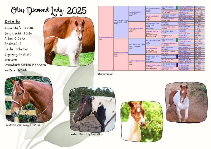 Hallo mein Name ist Okies Diamond Lady ❤️ und ich bin ein ganz tolles Paint Horse Mädchen. Mein stolzer Papa ist der Paint Horse Hengst Dancing Boys Okie und meine Mama ist Docs Magic Kathie, die mir auch immer erzählt dass nicht nur mein Papa schon oft im Rampenlicht stand sondern auch mein Opa ein ganz besonderer Hengst war. Meine Zweibeiner finden das ich sehr mutig bin und meinen ich bin ein echtes Powerpaket. Ich bin halt in meiner Kindergarten Gruppe gerne die Klassensprecherin... aber das liegt einfach daran das ich die größte und die stärkste bin und naja ich bin halt auch noch schneller, die Inteligenteste, und kann am besten posen, naja ich bin halt einfach die beste und meine Mama ist halt auch die coolste von allem ! Sie sagt mir halt immer dass ich vor nichts Angst haben muss! Die meiste Zeit verbringe ich mit meinen 3 Kindergarten Freunden, meinen Tanten und meinem Ziehpapa Tru Docscherokee der total coll ist und ganz viel mit uns unternimmt und natürlich auch mit meiner Mama auf der Weide. Aber ich darf auch immer mal wieder meine Mama auf Ausritten oder auf dem Reitplatz begleiten. Dass macht total Spaß, ich darf hier auch schon mutig voraus laufen zumindest mach ich das immer einfach. Zwei mal haben wir auch schon gebadet und ich liebe Wasser genau so wie meine Mama. Baden ist einfach toll. Ich kenne auch schon zweibeinige Kinder, Hunde,die sind toll denn da kann man immer hinter her flitzen, Traktoren die immer frisches Wasser und Heu auf die Weide bringen. Motorrad Fahrer und Quads haben wir auf Ausritten auch schon kennen gelernt und ich war schon auf einer Fohlenschau. Dass war toll, mit Musik und vielen Menschen mit Cowboy Hut die mich die ganze Zeit angesehen haben. Ich glaube sie mochten mich, da die mich ganz oft angelächelt haben und ich dann eine tolle Schleife und eine Urkunde bekommen habe. Meine Mama sagt dass es bald Zeit für mich wird einen ganz eigenen 2 Beiner für mich zu suchen. Darauf freue ich mich schon sehr. Also eigentlich ist mir egal wie mein späterer Zweibeiner aussieht er soll mutig sein wie ich ... ohh ein Herdenchef wäre cool mit dem ich gemeinsam die Welt erobern kann, Unternehmens Lustig und er muss Wasser mögen...ich liebe Wasser, vielleicht auch mit mir später Berge klettern geht oder Abenteuer Spielplätze, die sind toll. Mama sagt auch immer das Papa ein tolles Reining Pferd ist und Sie und Opa liebend gerne Kühe getrieben hat. Aber sie meint, sowas lernt man noch nicht im Kindergarten sondern erst wenn ich in die Schule komme aber vielleicht kann mir das ja dann mein eigener Zweibeiner alles zeigen. Ach so ich weiß nicht ob das wichtig ist... ich esse gerne aber das ist ja normal...ich will ja auch groß und so stark wie mein Papa werden. Vielleicht so 1.54m. Halt eine stattliche Stute und Herdenchefin wie meine Mama wäre toll. Meine Zweibeinigen Freunde meinen ich habe eine ganz tolle und besondere Persönlichkeit aber ich kann ja auch nichts dafür das mich eben alle mehr beachten und Mama sagt immer man soll zeigen was man kann. Ach so meine Zweibeiner hier Zuhause im Stall meinen wenn mir mein neuer Zweibeiner gefällt darf ich entweder umziehen oder auch noch zur weiteren Aufzucht in meinem Kindergarten hier bleiben und..... mein Zweibeiner kann mich auch in Ratenzahlung haben wie auch immer viel wichtiger ist das er mich liebt und mit mir durch Dick und Dünn gehen möchte. Ach so ich soll noch sagen ich bin 7 Panel N/ N und ein PHCG Prämien Fohlen aber da hab ich keine Ahnung was das heißt... Hauptsache du hast mich lieb . Besuchen kannst du mich in 06420 Könnern oder Ruf einfach bei mir im Stall an unter der 0172-3731301