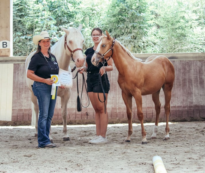 ✅ Knows the foal-ABC ✅ Well-behaved at the blacksmith ✅ Easily groomed and washed ✅ Trailers reliably ✅ Exhibits calmness and attentiveness in daily handling With top reining and ranch horse bloodlines, Heidi's balanced conformation and pleasant temperament provide excellent foundations for a versatile future. Her smooth, elastic gaits and her "will to please" suggest a bright future—whether in Western disciplines or as a dependable leisure partner. 🤎 🏆 At the PHCG Foal Show in Stoßberg, Heidi placed 3rd among filly foals with an overall score of 7.6 and was awarded the PHCG premium foal distinction.