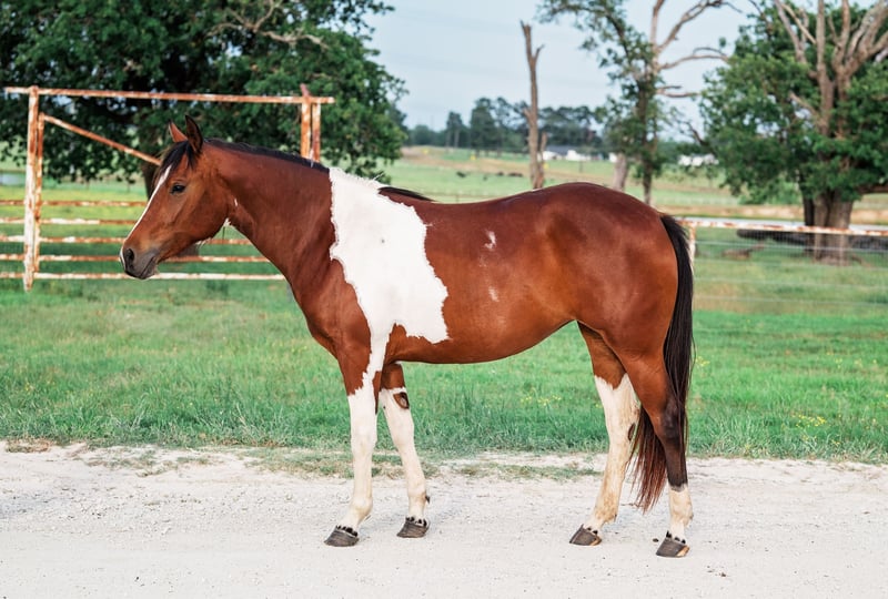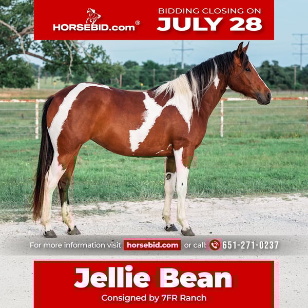 ⚔️ The HORSEMAN's Select ⚔️ Happening now thru MONDAY | JULY 28th - Available EXCLUSIVELY on HorseBid's website! For more details and to register visit: www.Horsebid.com CONSIGNOR CONTACT: 7FR Ranch 651-271-0237 LOCATION: Normangee, TX BREED: Paint REGISTERED: Yes REGISTERED NAME: QTS UVALDE GAL COLOR: Bay Tobiano HEIGHT: 14.3 AGE: 2 GENDER: Mare Jellie Bean’s sweet and gentle nature makes her an absolute joy to be around. She's the kind of horse that will greet you with a soft nuzzle and a willing attitude. Her impeccable ground manners make her a favorite in the barn. She ties, loads, baths, and crosses water with ease, making her an stress-free companion for any adventure. What sets Jellie Bean apart is her eagerness to please. She's a quick learner with a strong work ethic, always striving to meet your expectations. Her natural athleticism and well-built conformation make her a standout in any discipline. Whether you're looking for a trail horse, a show horse, or a loving companion, Jellie Bean has the potential to excel in any role.