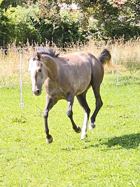 Assolutamente accattivante, molto maneggevole con molta gioia di movimento. Natura molto amichevole e affettuosa. Cresce in modo appropriato alla specie con il contatto sociale. Viene regolarmente sverminato e, naturalmente, vaccinato e scheggiato con un passaporto equino. Naturalmente, le insegneremo il puledro ABC in modo appropriato all'età 6 Panel sui genitori N/N
